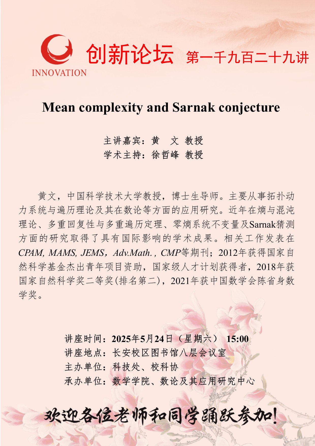 黄文 教授 乐投平台创新论坛第一千九百二十九讲:Mean complexity and Sarnak conjecture 讲座时间 2025年5月24日(星期六) 15:00 讲座地点 长安校区图书馆八层会议室 讲座人介绍 黄文 教授 讲座内容