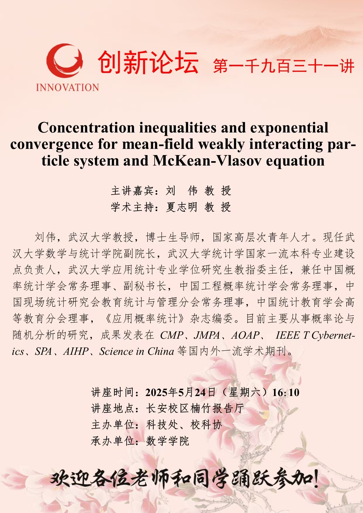 刘伟 教授 乐投平台创新论坛第一千九百三十一讲:Concentration inequalities and exponential convergence for mean-field weakly interacting particle system and McKean-Vlasov equation 讲座时间 2025年5月24日(星期六)16:10 讲座地点 长安校区楠竹报告厅 讲座人介绍 刘伟 教授 讲座内容