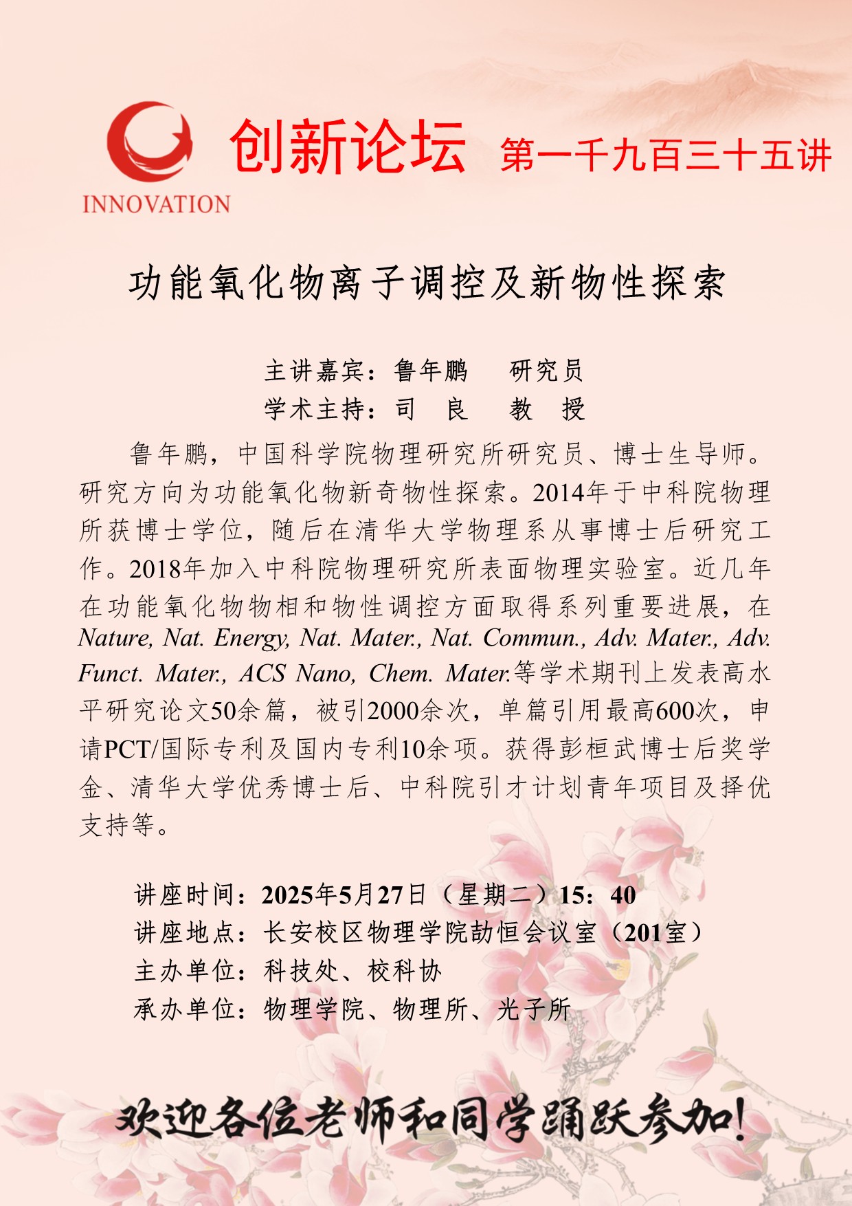 鲁年鹏 研究员 乐投平台创新论坛第一千九百三十五讲:功能氧化物离子调控及新物性探索 讲座时间 2025年5月27日(星期二)15:40 讲座地点 长安校区物理学院劼恒会议室(201室) 讲座人介绍 鲁年鹏 研究员 讲座内容