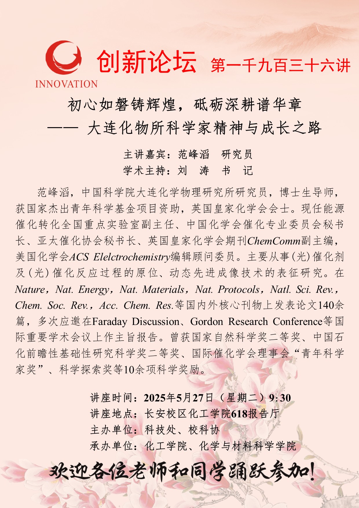 范峰滔 研究员 乐投平台创新论坛第一千九百三十六讲:初心如磐铸辉煌,砥砺深耕谱华章——大连化物所科学家精神与成长之路 讲座时间 2025年5月27日(星期二)9:30 讲座地点 长安校区化工学院618报告厅 讲座人介绍 范峰滔 研究员 讲座内容