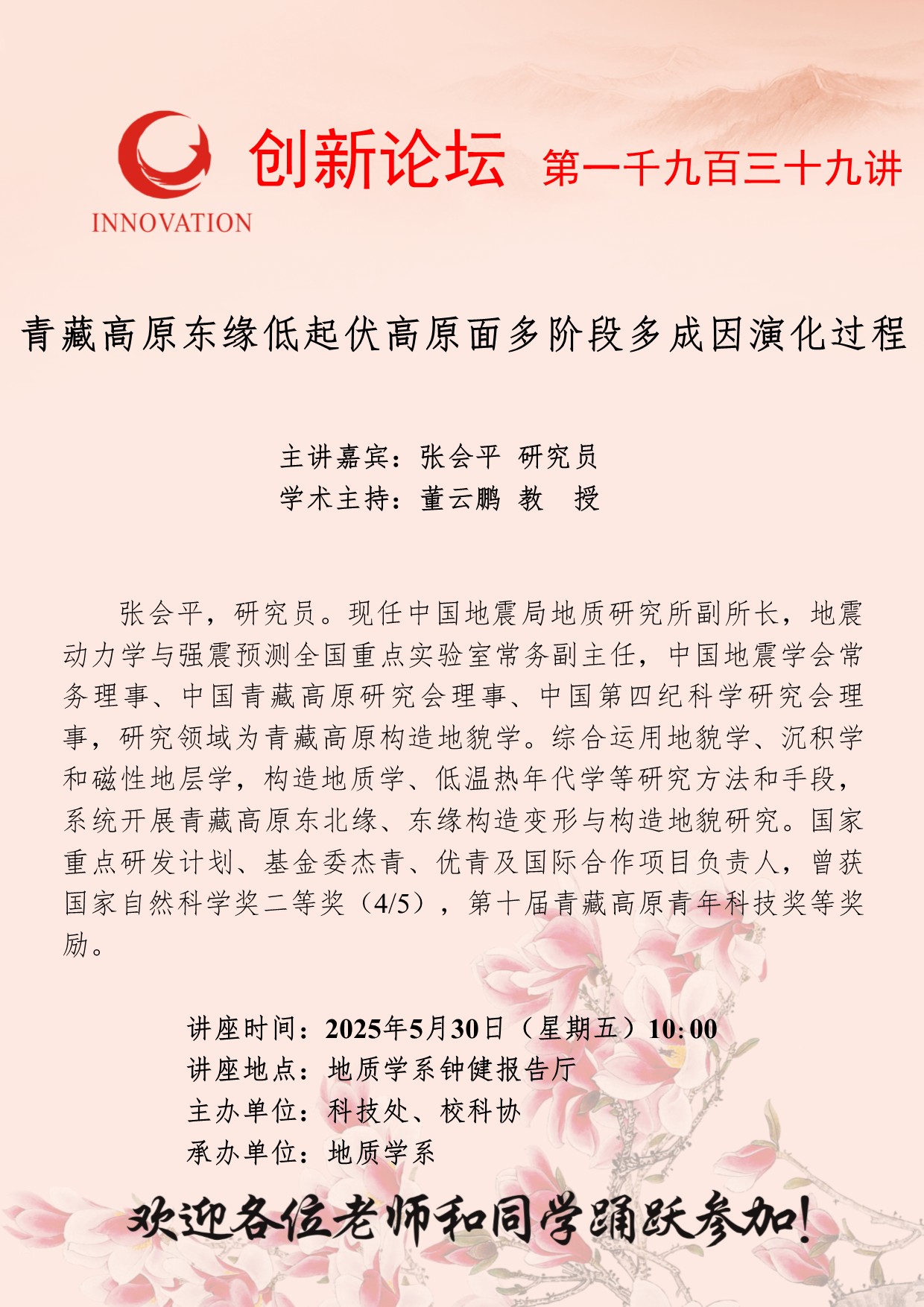张会平 研究员 乐投平台创新论坛第一千九百三十九讲:青藏高原东缘低起伏高原面多阶段多成因演化过程 讲座时间 2025年5月30日(星期五)10:00 讲座地点 地质学系钟健报告厅 讲座人介绍 张会平 研究员 讲座内容