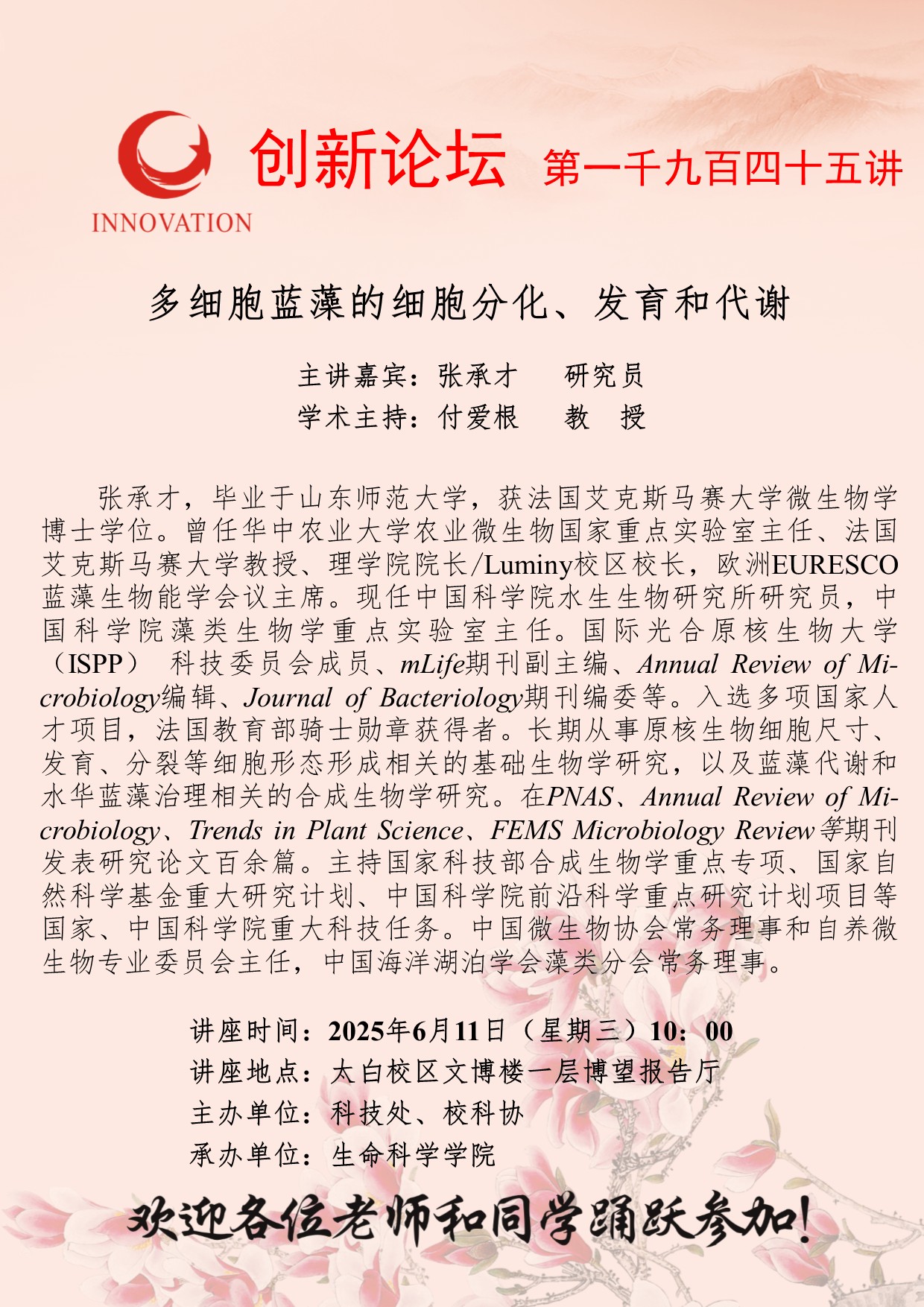 张承才 研究员 乐投平台创新论坛第一千九百四十五讲:多细胞蓝藻的细胞分化、发育和代谢 讲座时间 2025年6月11日(星期三)10:00 讲座地点 太白校区文博楼一层博望报告厅 讲座人介绍 张承才 研究员 讲座内容
