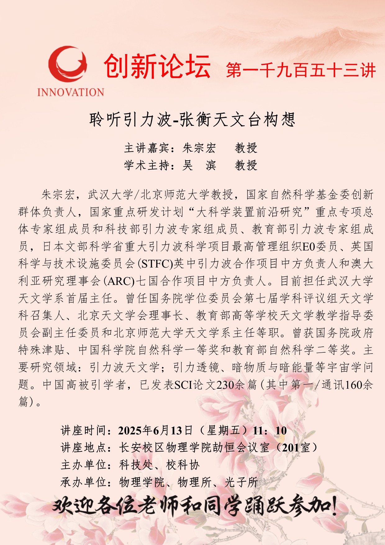 朱宗宏 教授 乐投平台创新论坛第一千九百五十三讲:聆听引力波-张衡天文台构想 讲座时间 2025年6月13日(星期五)11:10 讲座地点 长安校区物理学院劼恒会议室(201室) 讲座人介绍 朱宗宏 教授 讲座内容