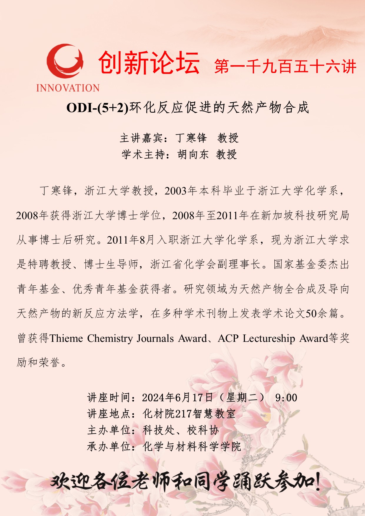 丁寒锋 教授 乐投平台创新论坛第一千九百五十六讲:ODI-(5+2)环化反应促进的天然产物合成 讲座时间 2024年6月17日(星期二) 9:00 讲座地点 化材院217智慧教室 讲座人介绍 丁寒锋 教授 讲座内容