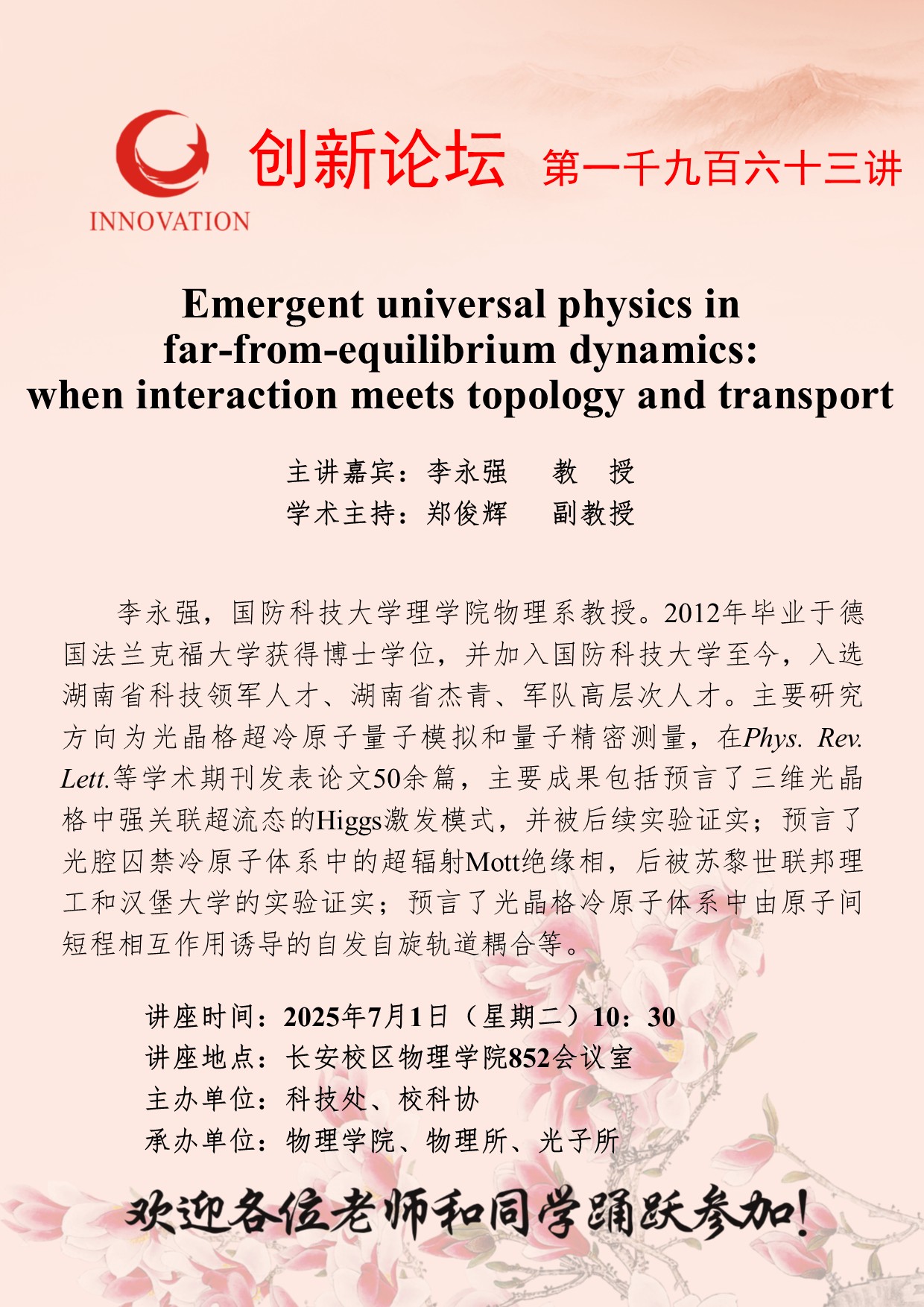 李永强 教授 乐投平台创新论坛第一千九百六十三讲:Emergent universal physics in far-from-equilibrium dynamics: when interaction meets topology and transport 讲座时间 2025年7月1日(星期二)10:30 讲座地点 长安校区物理学院852会议室 讲座人介绍 李永强 教授 讲座内容