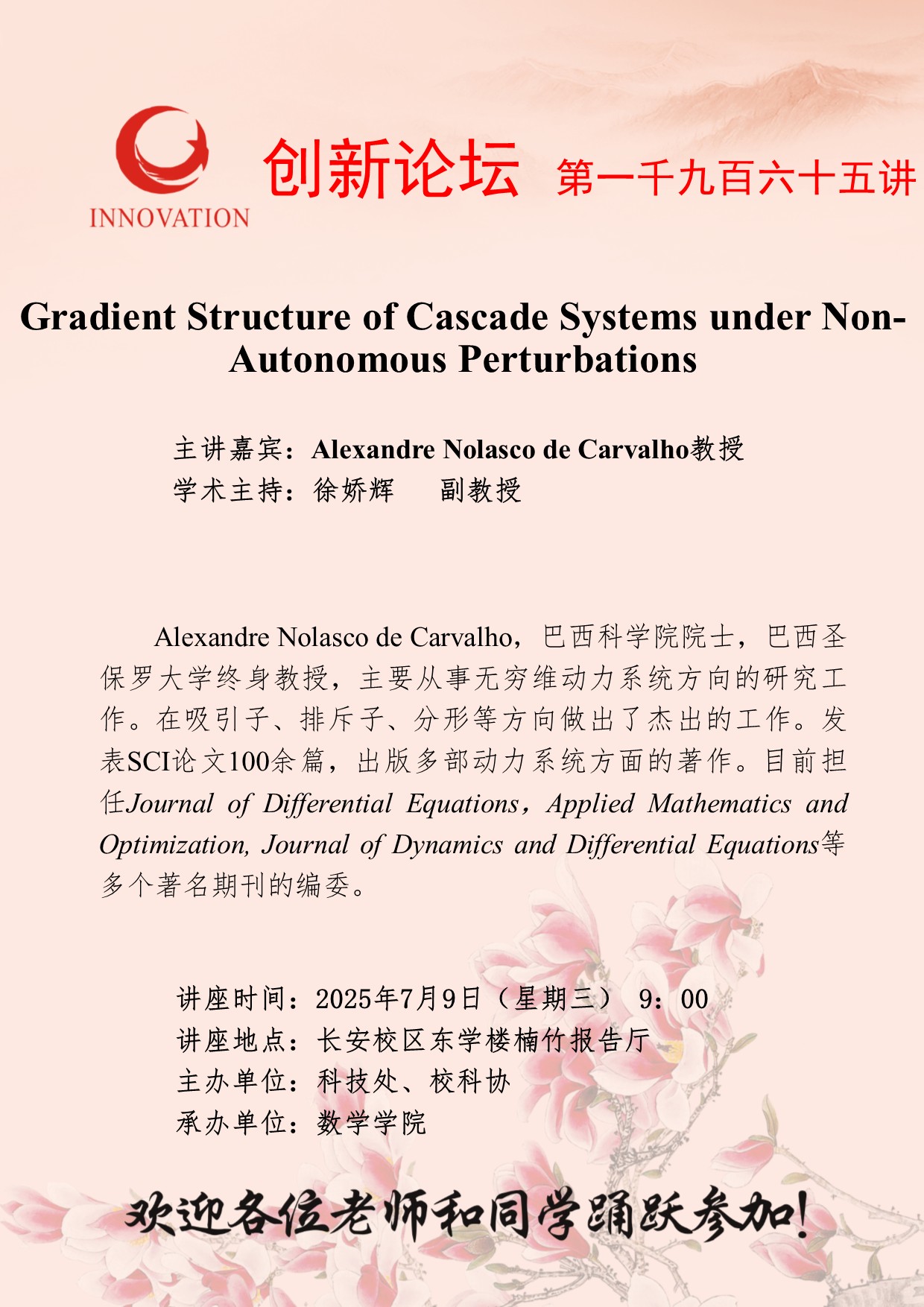 Alexandre Nolasco de Carvalho 教授 乐投平台创新论坛第一千九百六十五讲:Gradient Structure of Cascade Systems under Non-Autonomous Perturbations 讲座时间 2025年7月9日(星期三) 9:00 讲座地点 长安校区东学楼楠竹报告厅 讲座人介绍 Alexandre Nolasco de Carvalho 教授 讲座内容