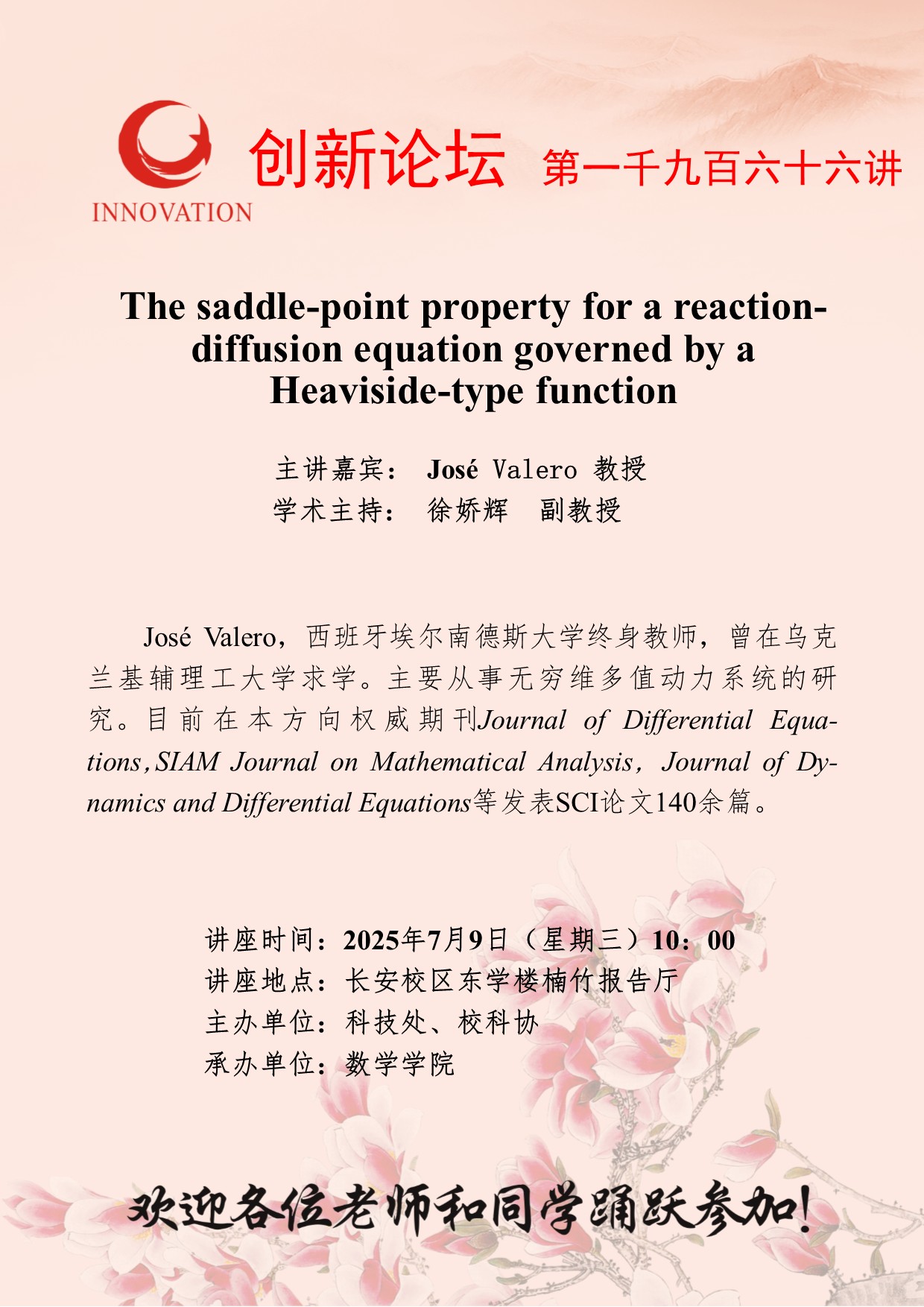 José Valero 教授 乐投平台创新论坛第一千九百六十六讲:The saddle-point property for a reaction-diffusion equation governed by a Heaviside-type function 讲座时间 2025年7月9日(星期三)10:00 讲座地点 长安校区东学楼楠竹报告厅 讲座人介绍 José Valero 教授 讲座内容