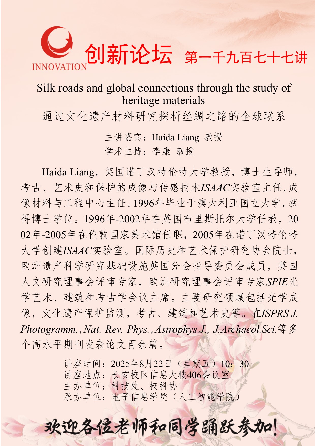 梁海达 教授 乐投平台创新论坛第一千九百七十七讲:Silk roads and global connections through the study of heritage materials 讲座时间 2025年8月22日(星期五)10:30 讲座地点 长安校区信息大楼406会议室 讲座人介绍 梁海达 教授 讲座内容