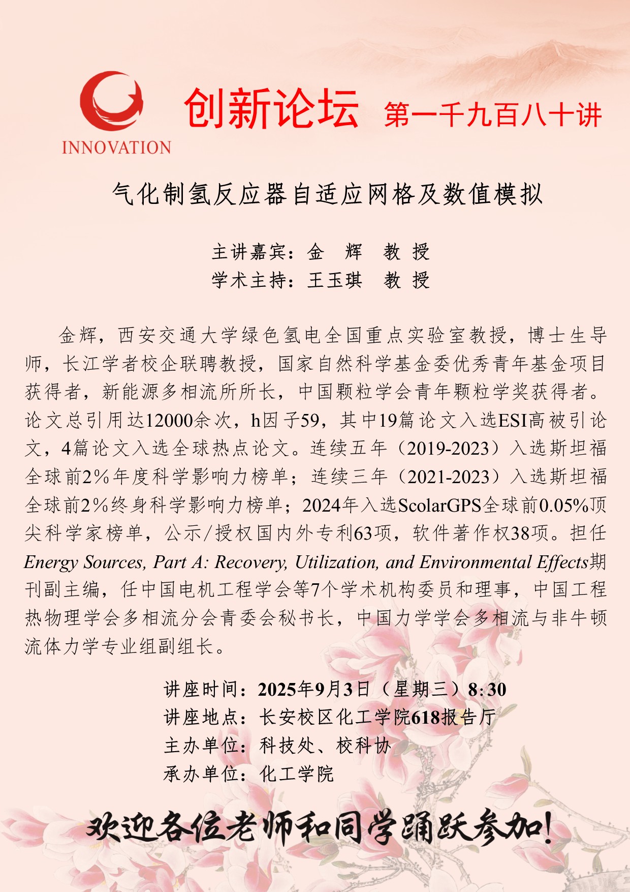 金辉 教授 乐投平台创新论坛第一千九百八十讲:气化制氢反应器自适应网格及数值模拟 讲座时间 2025年9月3日(星期三)8:30 讲座地点 长安校区化工学院618报告厅 讲座人介绍 金辉 教授 讲座内容