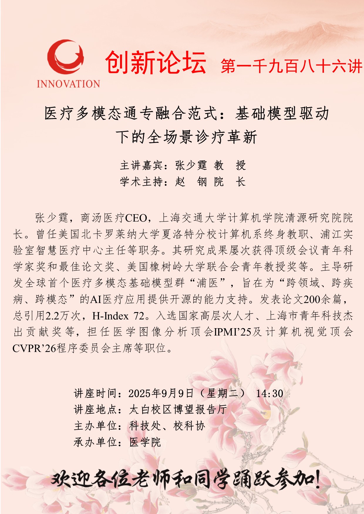 张少霆 教 授 乐投平台创新论坛第一千九百八十六讲:医疗多模态通专融合范式:基础模型驱动下的全场景诊疗革新 讲座时间 2025年9月9日(星期二) 14:30 讲座地点 太白校区博望报告厅 讲座人介绍 张少霆 教 授 讲座内容 fu