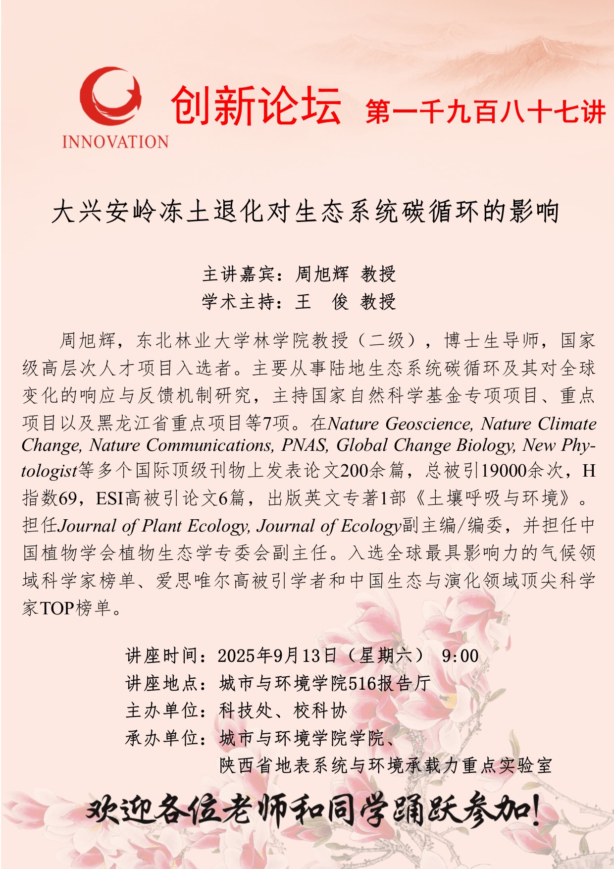 周旭辉 教授 乐投平台创新论坛第一千九百八十七讲:大兴安岭冻土退化对生态系统碳循环的影响 讲座时间 2025年9月13日(星期六) 讲座地点 城市与环境学院516报告厅 讲座人介绍 周旭辉 教授 讲座内容