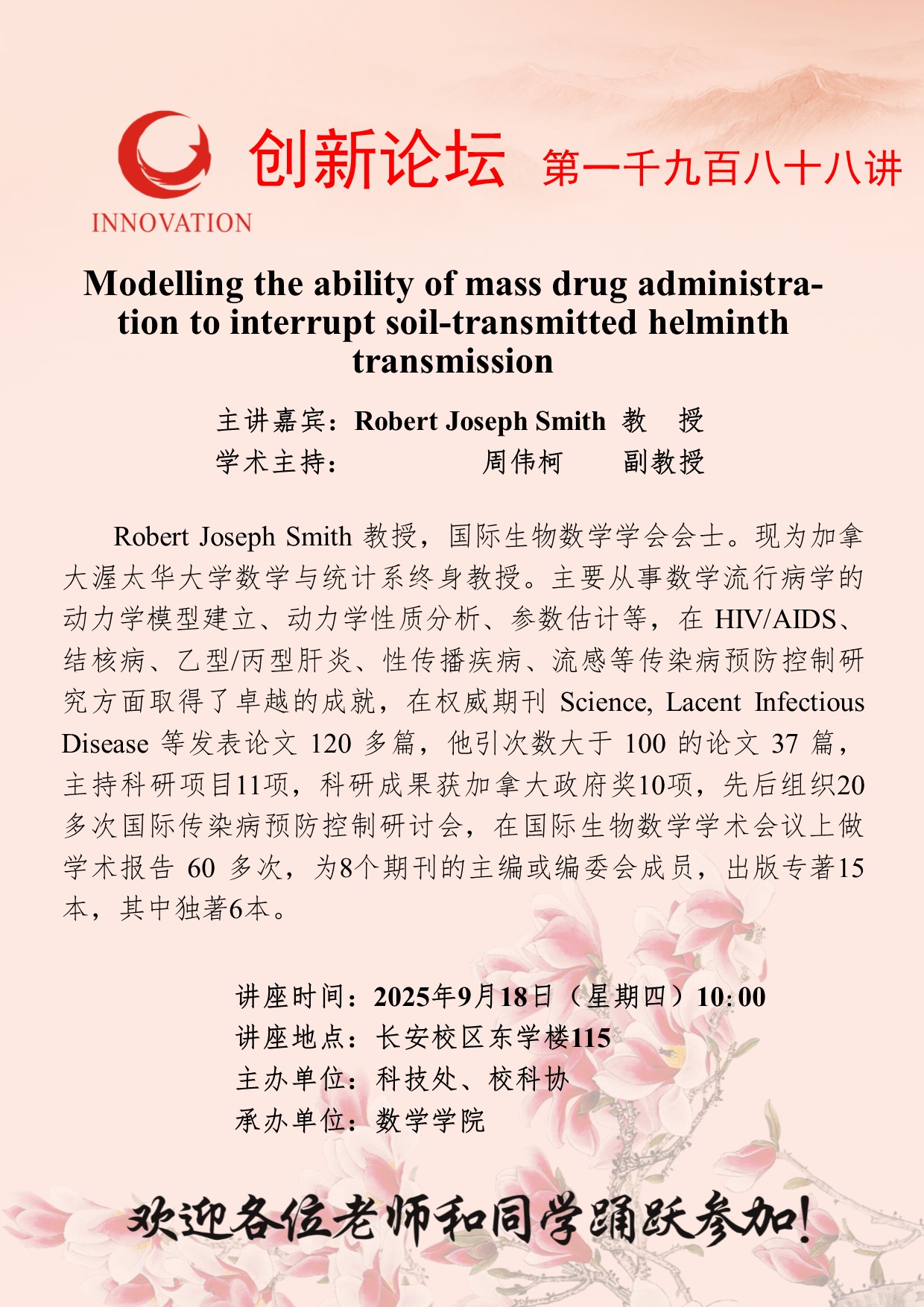 Robert Joseph Smith 教授 乐投平台创新论坛第一千九百八十八讲:Modelling the ability of mass drug administration to interrupt soil-transmitted helminth transmission 讲座时间 2025年9月18日(星期四)10:00 讲座地点 长安校区东学楼115 讲座人介绍 Robert Joseph Smith 教授 讲座内容