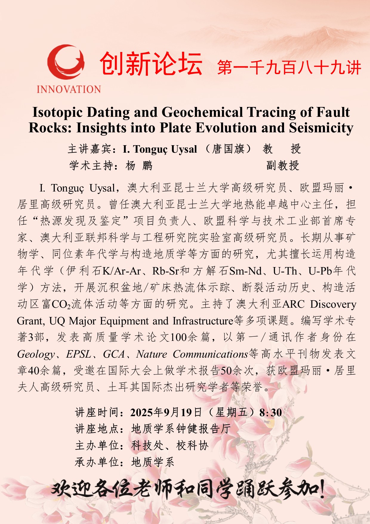 I. Tonguç Uysal 教授 乐投平台创新论坛第一千九百八十九讲:Isotopic Dating and Geochemical Tracing of Fault Rocks: Insights into Plate Evolution and Seismicity 讲座时间 2025年9月19日(星期五)8:30 讲座地点 地质学系钟健报告厅 讲座人介绍 I. Tonguç Uysal 教授 讲座内容