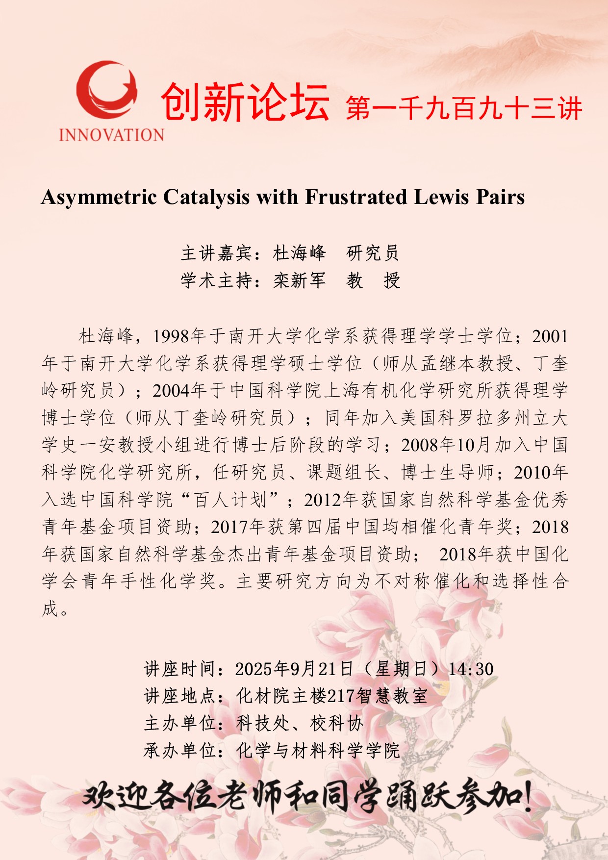 杜海峰 研究员 乐投平台创新论坛第一千九百九十三讲:Asymmetric Catalysis with Frustrated Lewis Pairs 讲座时间 2025年9月21日(星期日)14:30 讲座地点 化材院主楼217智慧教室 讲座人介绍 杜海峰 研究员 讲座内容