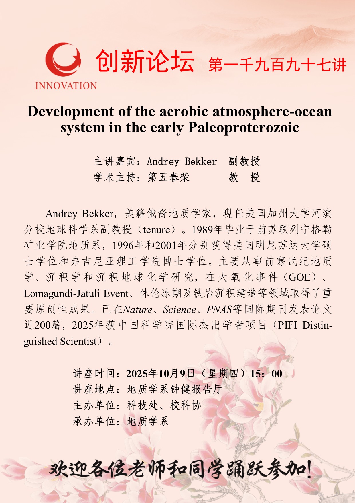 Andrey Bekker 副教授 乐投平台创新论坛第一千九百九十七讲:Development of the aerobic atmosphere-ocean system in the early Paleoproterozoic 讲座时间 2025年10月9日(星期四)15:00 讲座地点 地质学系钟健报告厅 讲座人介绍 Andrey Bekker 副教授 讲座内容
