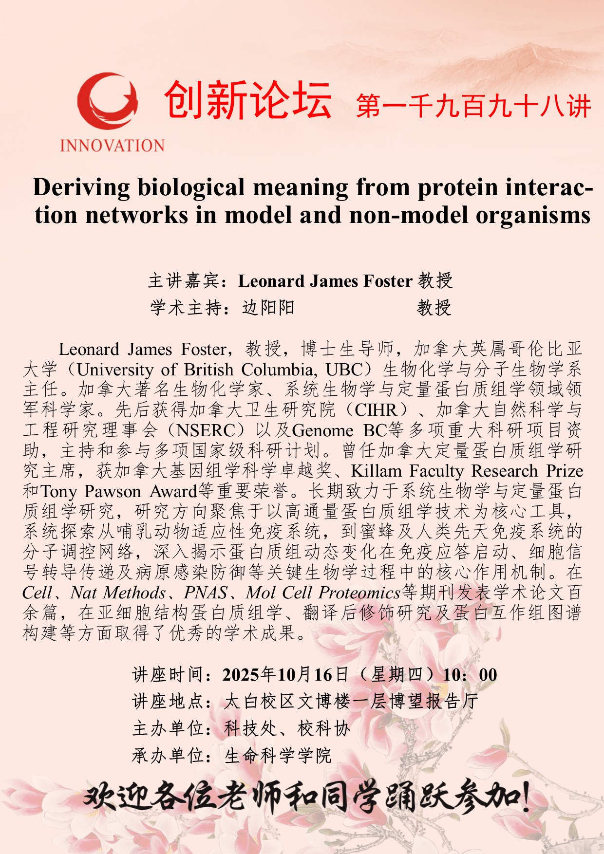 Leonard James Foster 教授 乐投平台创新论坛第一千九百九十八讲:Deriving biological meaning from protein interaction networks in model and non-model organisms 讲座时间 2025年10月16日(星期四)10:00 讲座地点 太白校区文博楼一层博望报告厅 讲座人介绍 Leonard James Foster 教授 讲座内容