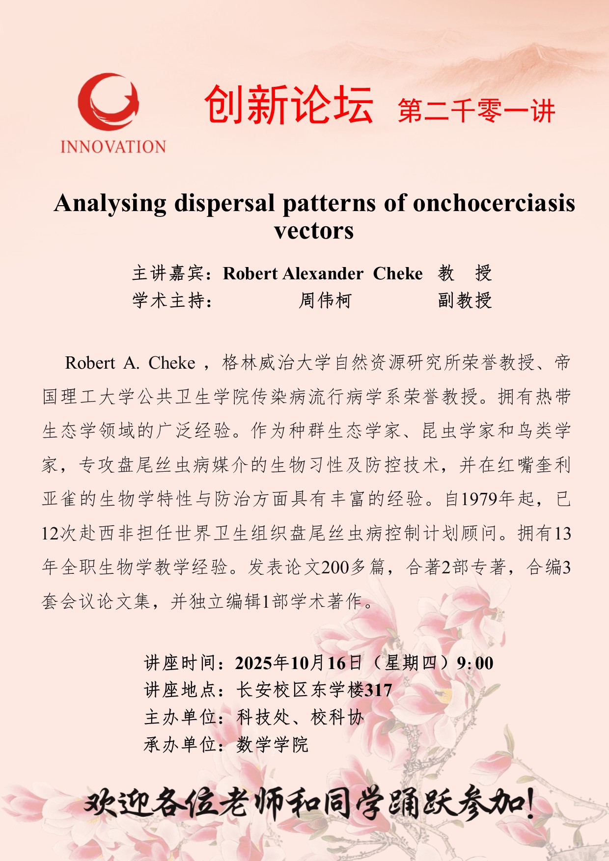 Robert Alexander Cheke 教授 乐投平台创新论坛第二千零一讲:Analysing dispersal patterns of onchocerciasis vectors 讲座时间 2025年10月16日(星期四)9:00 讲座地点 长安校区东学楼317 讲座人介绍 Robert Alexander Cheke 教授 讲座内容
