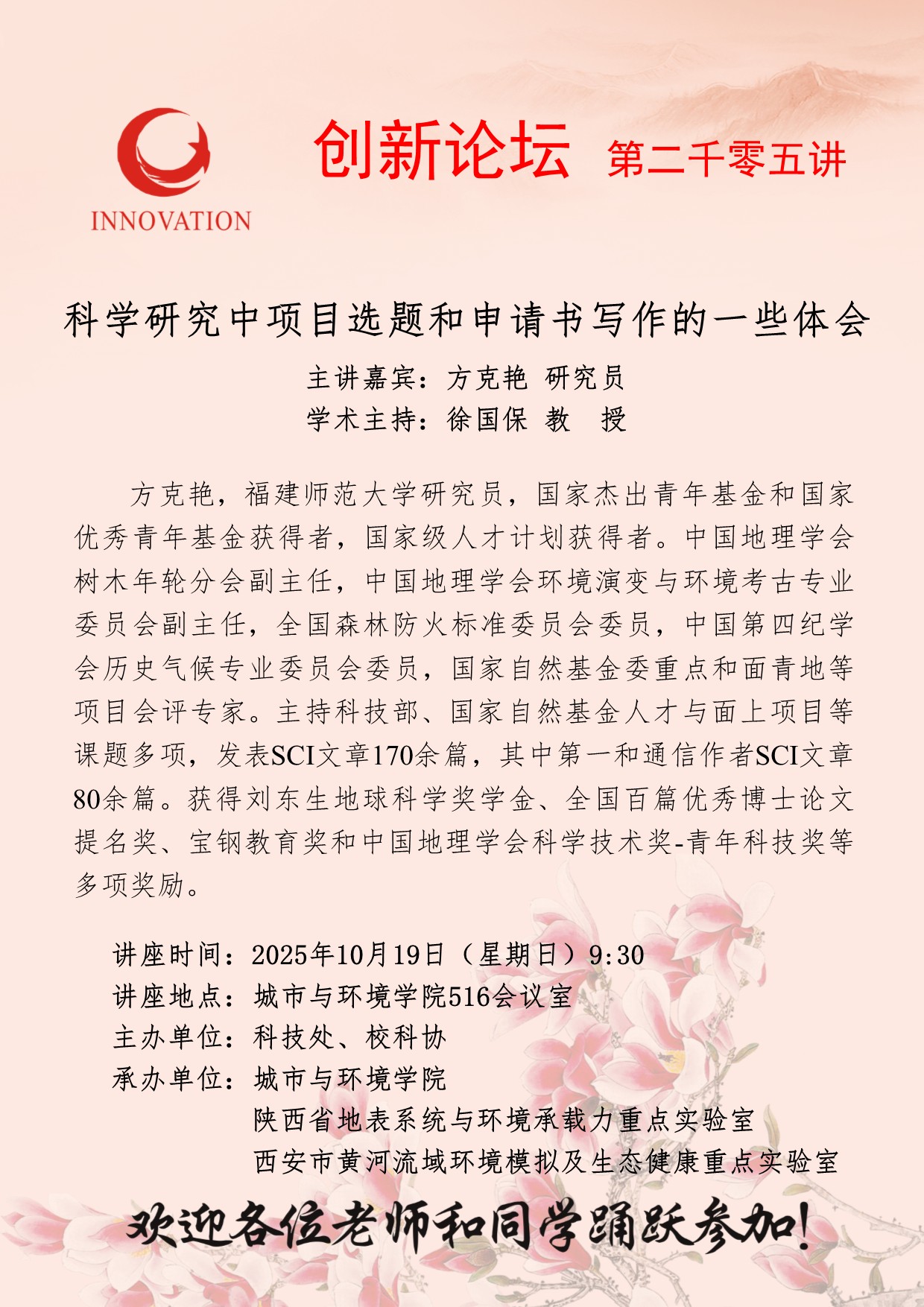 方克艳 研究员 乐投平台创新论坛第二千零五讲:科学研究中项目选题和申请书写作的一些体会 讲座时间 2025年10月19日(星期日)9:30 讲座地点 城市与环境学院516会议室 讲座人介绍 方克艳 研究员 讲座内容