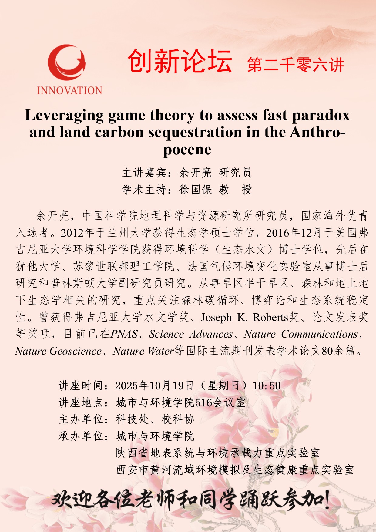 余开亮 研究员 乐投平台创新论坛第二千零六讲:Leveraging game theory to assess fast paradoxand land carbon sequestration in the Anthro-pocene 讲座时间 2025年10月19日(星期日)10:50 讲座地点 城市与环境学院516会议室 讲座人介绍 余开亮 研究员 讲座内容