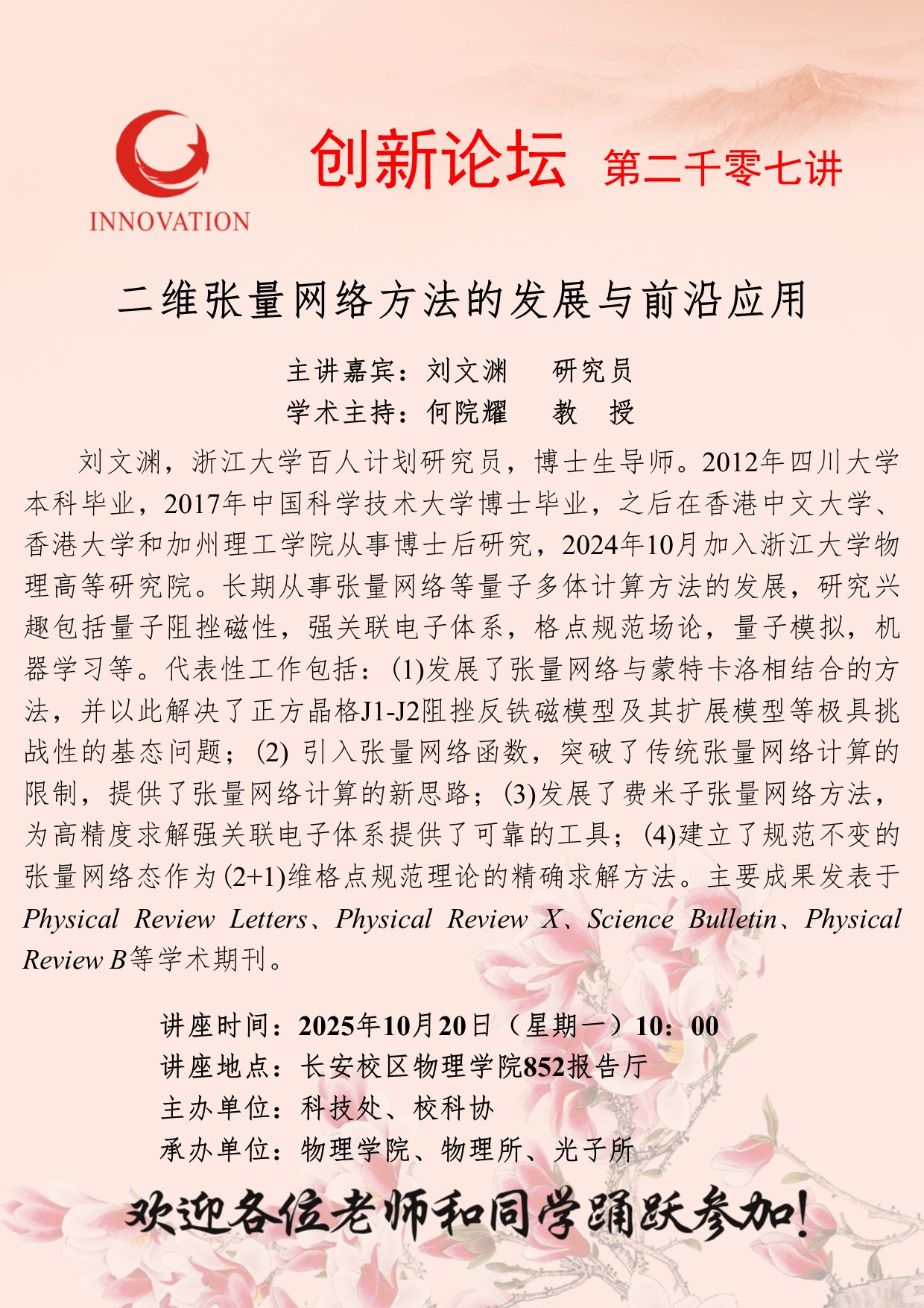 刘文渊 研究员 乐投平台创新论坛第二千零七讲:二维张量网络方法的发展与前沿应用 讲座时间 2025年10月20日(星期一)10:00 讲座地点 长安校区物理学院852报告厅 讲座人介绍 刘文渊 研究员 讲座内容