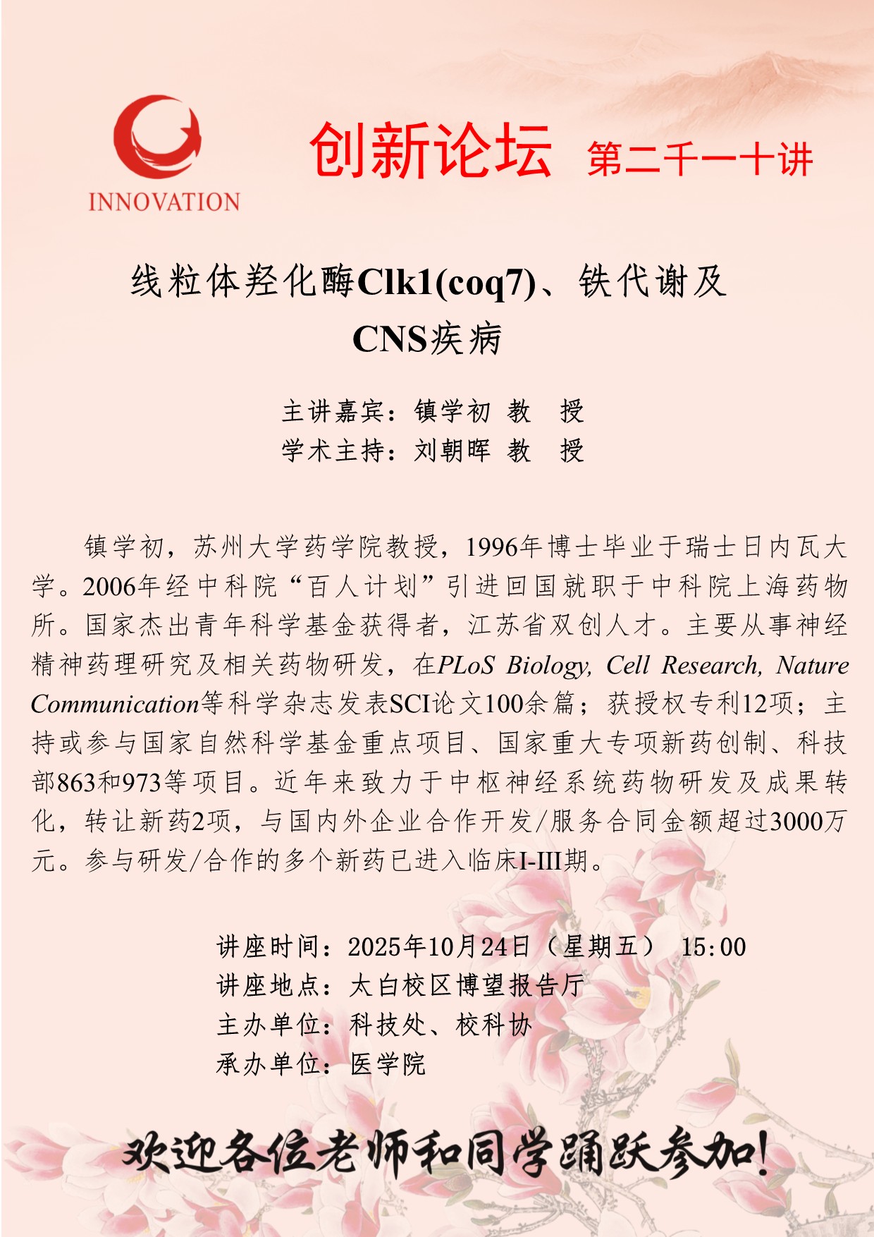 镇学初 教授 乐投平台创新论坛第二千一十讲:线粒体羟化酶Clk1(coq7)、铁代谢及CNS疾病 讲座时间 2025年10月24日(星期五) 15:00 讲座地点 太白校区博望报告厅 讲座人介绍 镇学初 教授 讲座内容