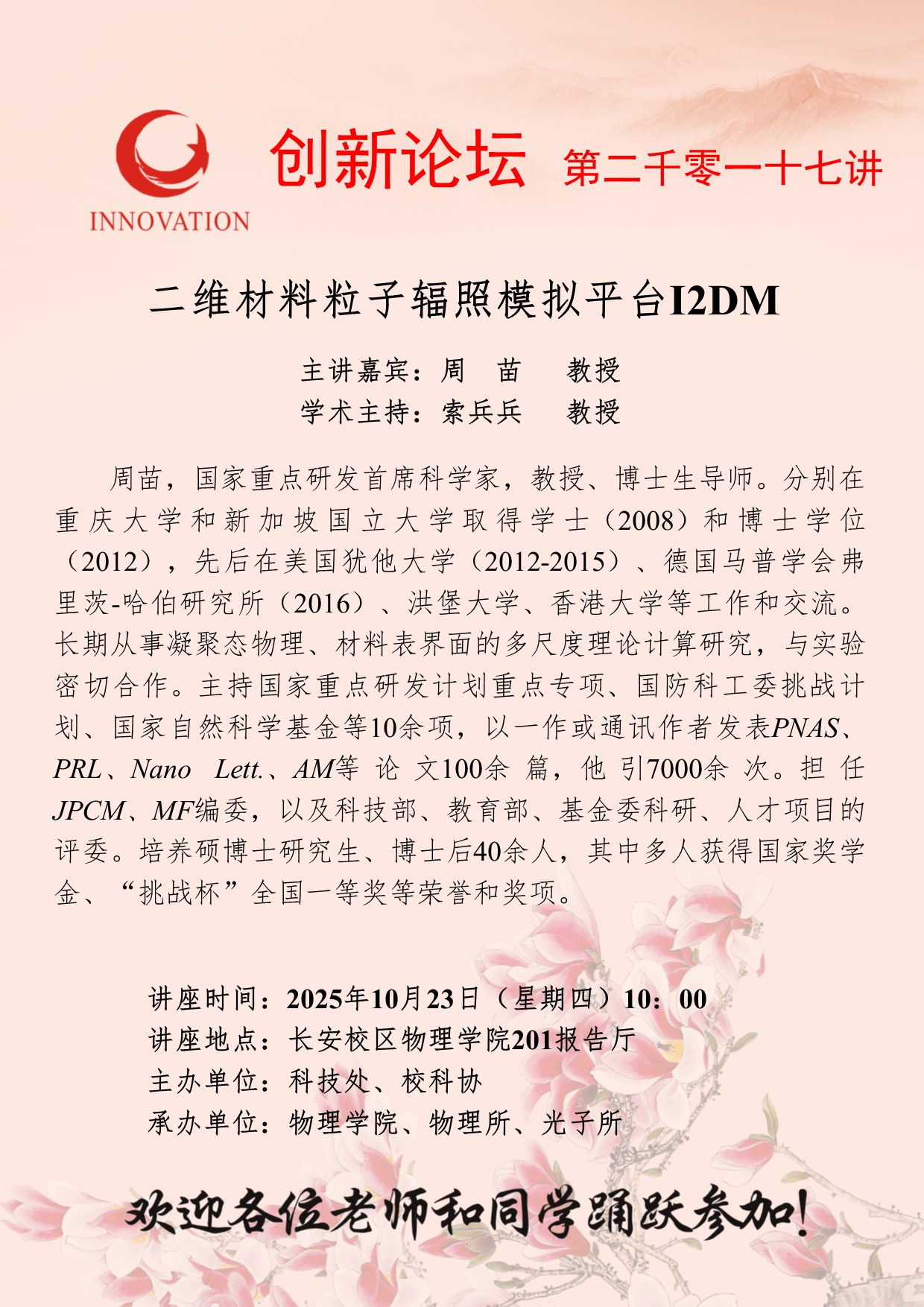 周苗 教授 乐投平台创新论坛第二千零一十七讲:二维材料粒子辐照模拟平台I2DM 讲座时间 2025年10月23日(星期四)10:00 讲座地点 长安校区物理学院201报告厅 讲座人介绍 周苗 教授 讲座内容