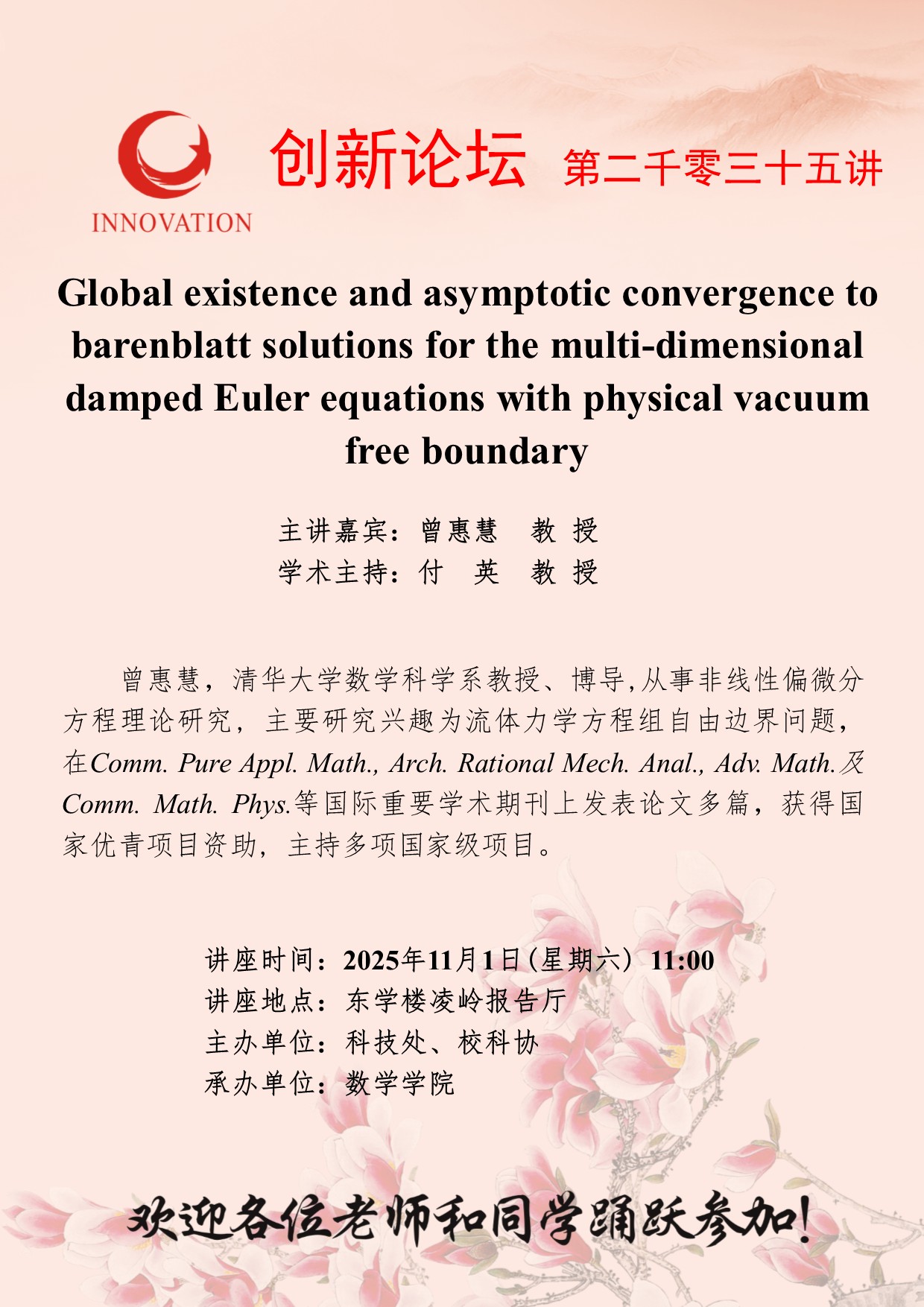 曾惠慧 教 授 乐投平台创新论坛第二千零三十五讲:Global existence and asymptotic convergence to barenblatt solutions for the multi-dimensional damped Euler equations with physical vacuum free boundary 讲座时间 2025年11月1日(星期六) 11:00 讲座地点 东学楼凌岭报告厅 讲座人介绍 曾惠慧 教 授 讲座内容