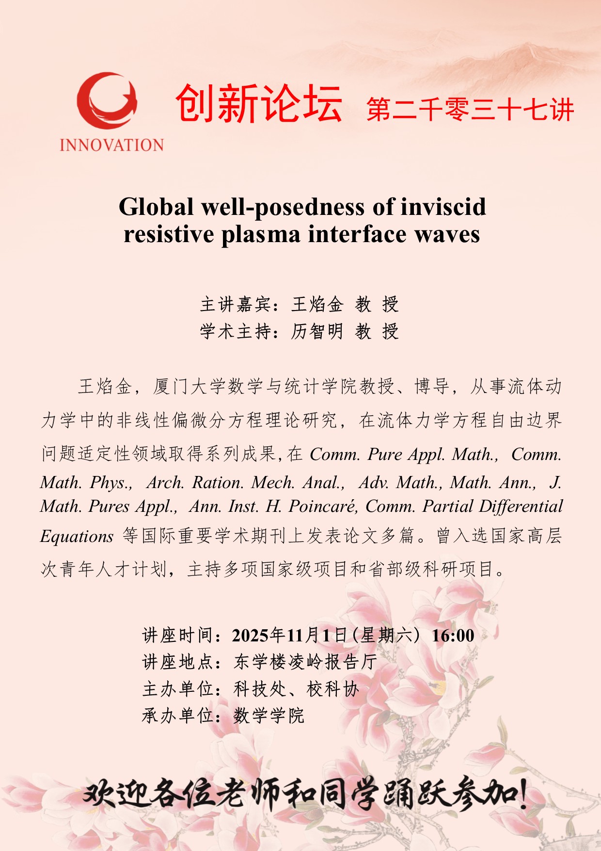 王焰金 教 授 乐投平台创新论坛第二千零三十七讲:Global well-posedness of inviscid resistive plasma interface waves 讲座时间 2025年11月1日(星期六) 16:00 讲座地点 东学楼凌岭报告厅 讲座人介绍 王焰金 教 授 讲座内容