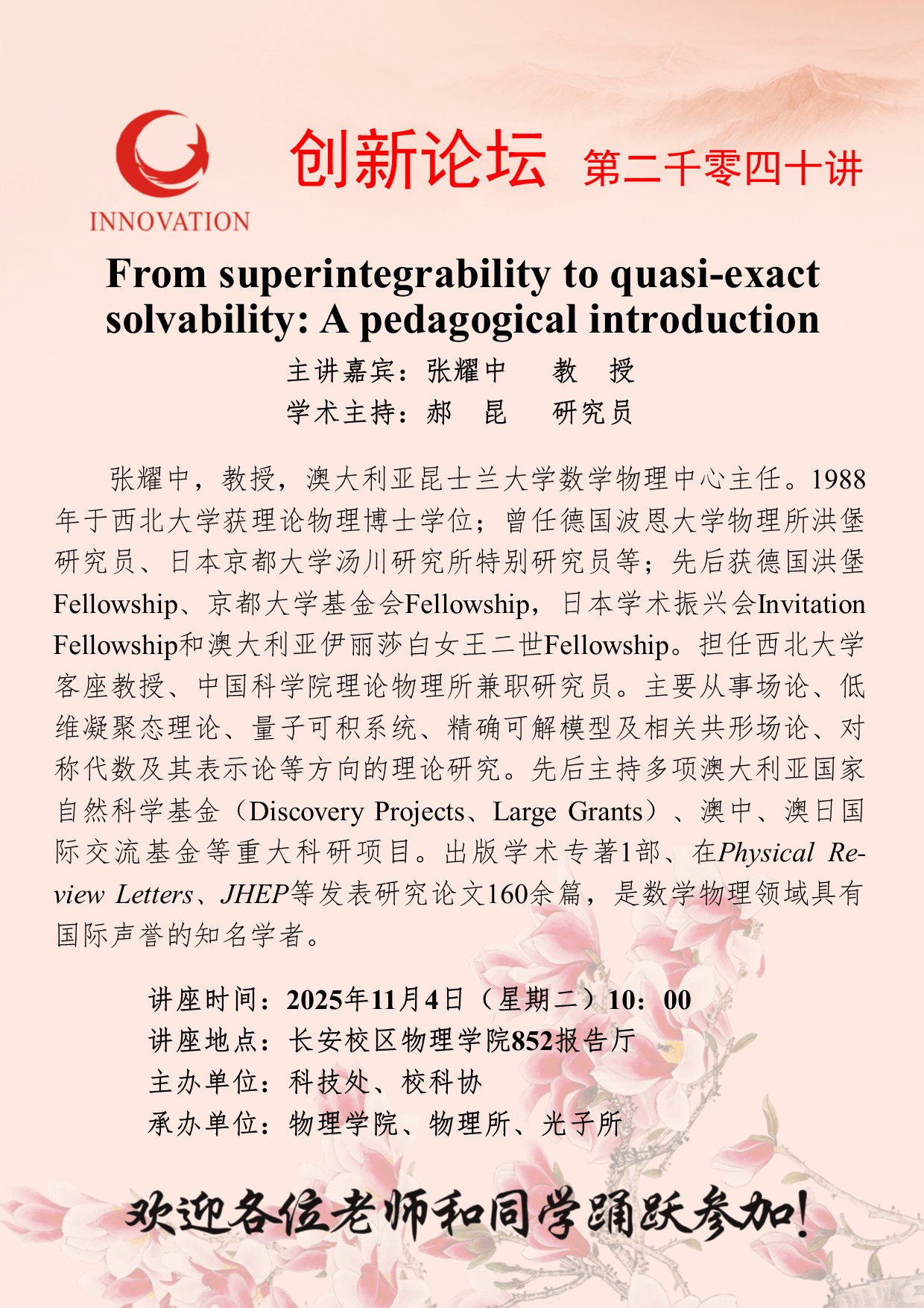 张耀中 教授 乐投平台创新论坛第二千零四十讲:From superintegrability to quasi-exact solvability: A pedagogical introduction 讲座时间 2025年11月4日(星期二)10:00 讲座地点 长安校区物理学院852报告厅 讲座人介绍 张耀中 教授 讲座内容