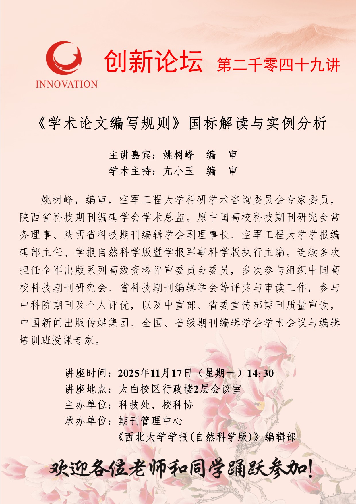 姚树峰 编审 乐投平台创新论坛第二千零四十九讲:《学术论文编写规则》国标解读与实例分析 讲座时间 2025年11月17日(星期一)14:30 讲座地点 太白校区行政楼2层会议室 讲座人介绍 姚树峰 编审 讲座内容