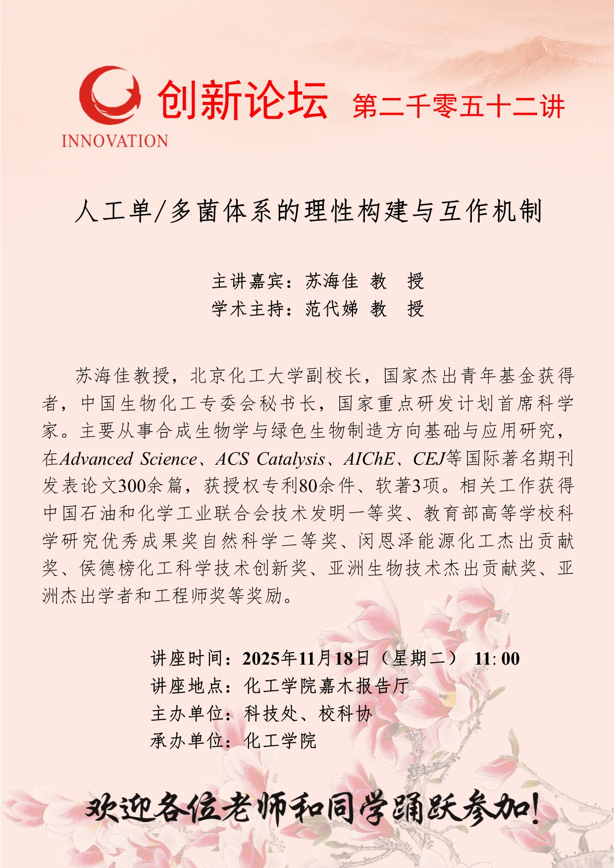 苏海佳 教授 乐投平台创新论坛第二千零五十二讲:人工单/多菌体系的理性构建与互作机制 讲座时间 2025年11月18日(星期二) 11: 00 讲座地点 化工学院嘉木报告厅 讲座人介绍 苏海佳 教授 讲座内容