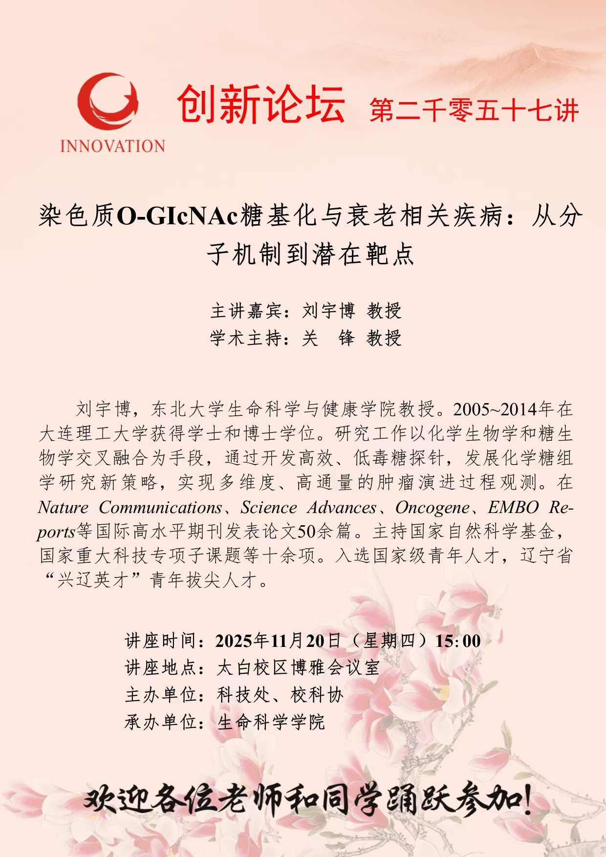 刘宇博 教授 乐投平台创新论坛第二千零五十七讲:染色质O-GIcNAc糖基化与衰老相关疾病:从分子机制到潜在靶点 讲座时间 2025年11月20日(星期四)15:00 讲座地点 太白校区博雅会议室 讲座人介绍 刘宇博 教授 讲座内容