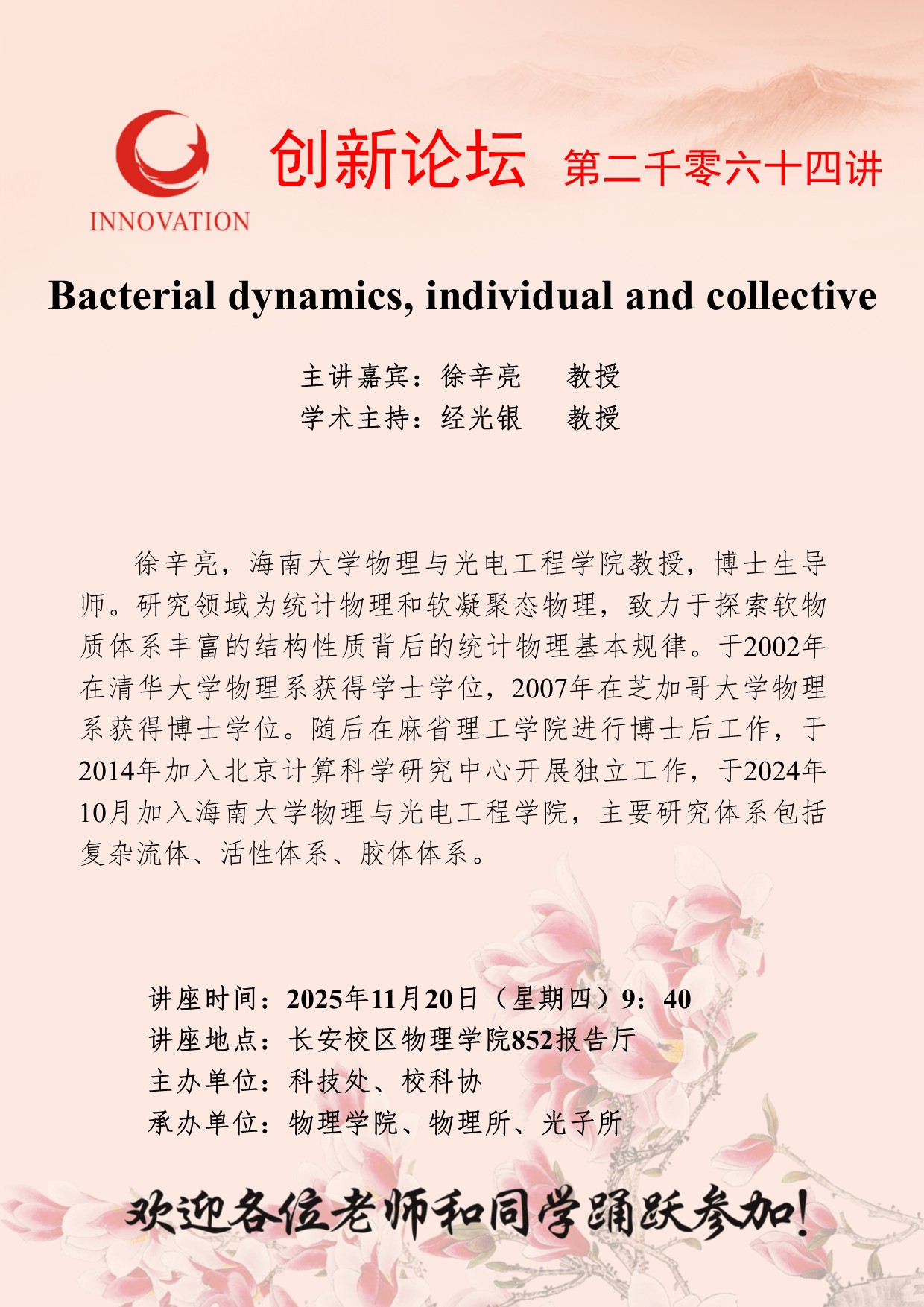 徐辛亮 教授 乐投平台创新论坛第二千零六十四讲:Bacterial dynamics, individual and collective 讲座时间 2025年11月20日(星期四)9:40 讲座地点 长安校区物理学院852报告厅 讲座人介绍 徐辛亮 教授 讲座内容