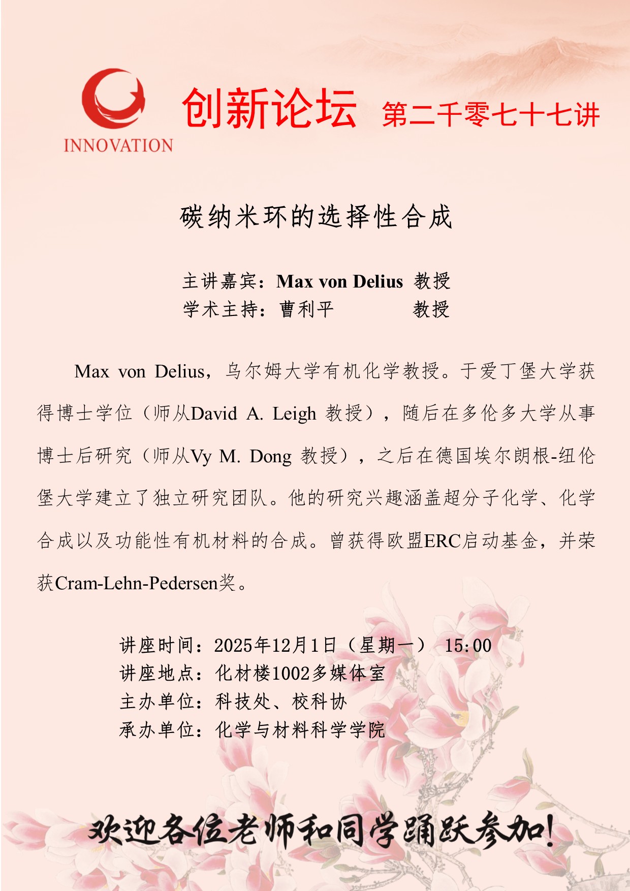 Max von Delius 教授 乐投平台创新论坛第二千零七十七讲:碳纳米环的选择性合成 讲座时间 2025年12月1日(星期一) 15:00 讲座地点 化材楼1002多媒体室 讲座人介绍 Max von Delius 教授 讲座内容
