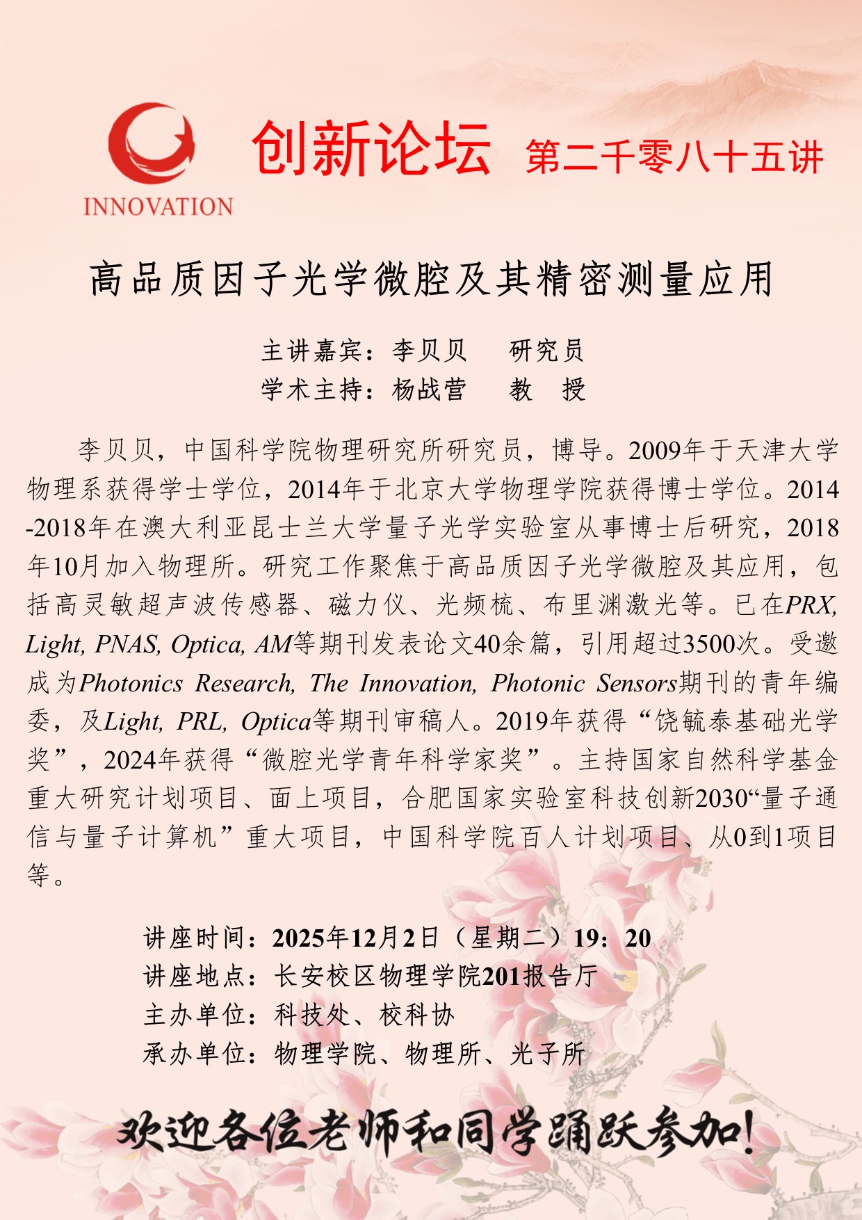 李贝贝 研究员 乐投平台创新论坛第二千零八十五讲:高品质因子光学微腔及其精密测量应用 讲座时间 2025年12月2日(星期二)19:20 讲座地点 长安校区物理学院201报告厅 讲座人介绍 李贝贝 研究员 讲座内容