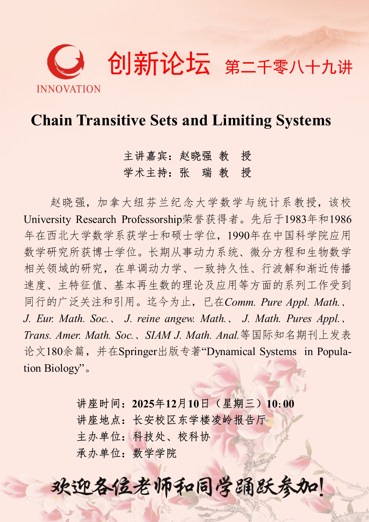 赵晓强 教授 乐投平台创新论坛第二千零八十九讲:Chain Transitive Sets and Limiting Systems 讲座时间 2025年12月10日(星期三)10:00 讲座地点 长安校区东学楼凌岭报告厅 讲座人介绍 赵晓强 教授 讲座内容
