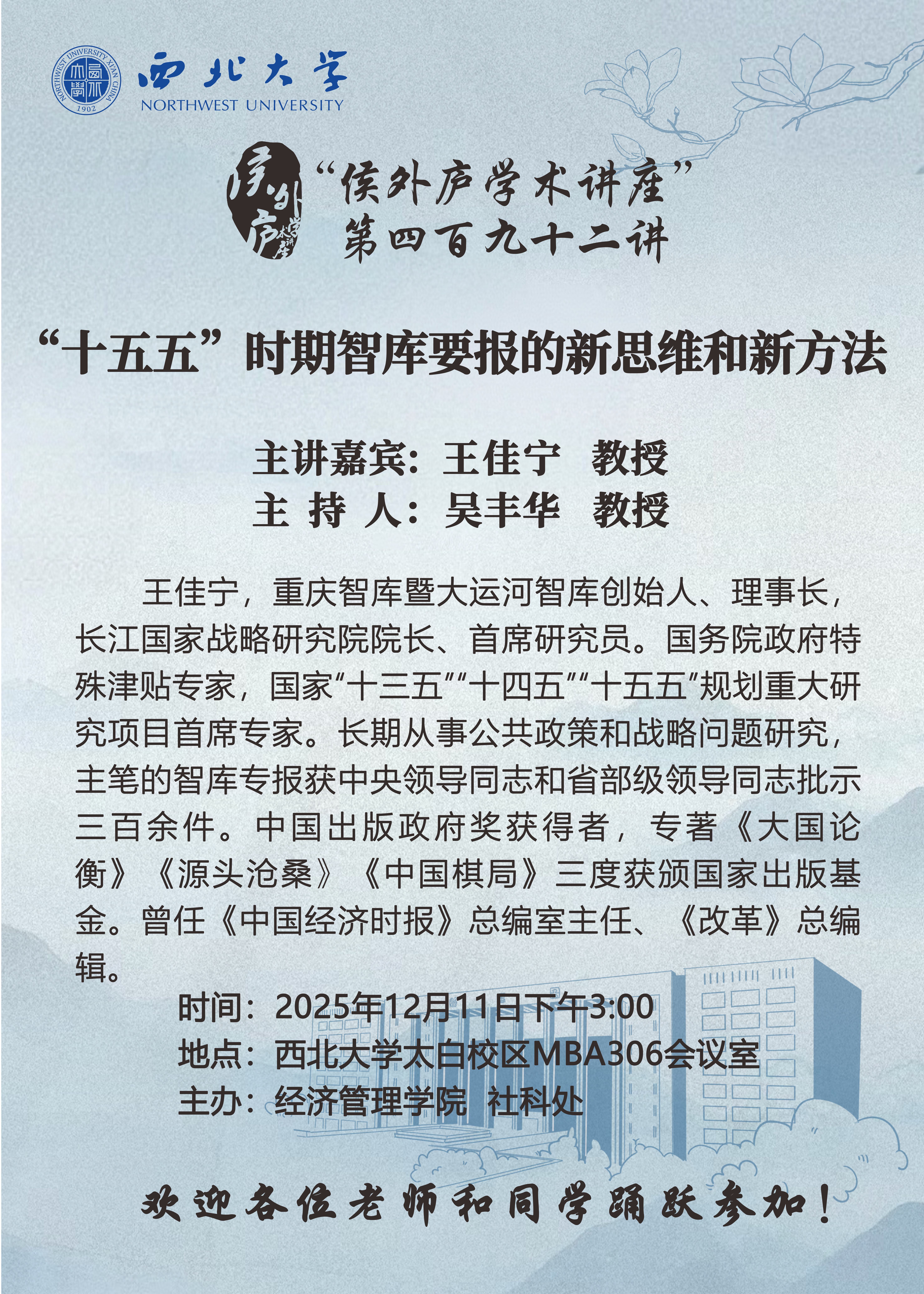 王佳宁 教授 “侯外庐学术讲座” 第四百九十二讲:“十五五”时期智库要报的新思维和新方法 讲座时间 2025年12月11日(星期四)下午3:00 讲座地点 乐投平台太白校区MBA306会议室 讲座人介绍 王佳宁 教授 讲座内容