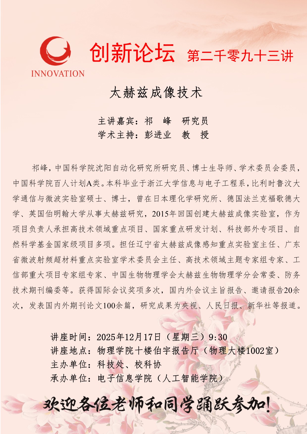 祁峰 研究员 乐投平台创新论坛第二千零九十三讲:太赫兹成像技术 讲座时间 2025年12月17日(星期三)9:30 讲座地点 物理学院十楼伯宇报告厅(物理大楼1002室) 讲座人介绍 祁峰 研究员 讲座内容