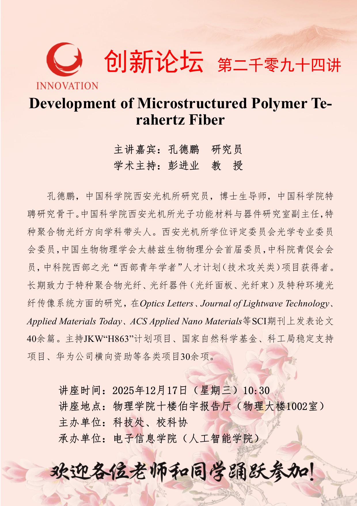 孔德鹏 研究员 乐投平台创新论坛第二千零九十四讲:Development of Microstructured Polymer Terahertz Fiber 讲座时间 2025年12月17日(星期三)10:30 讲座地点 物理学院十楼伯宇报告厅(物理大楼1002室) 讲座人介绍 孔德鹏 研究员 讲座内容