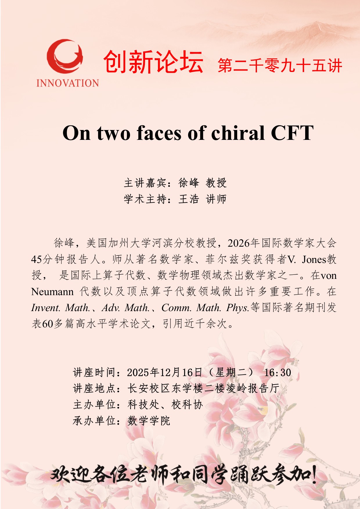 徐峰 教授 乐投平台创新论坛第二千零九十五讲:On two faces of chiral CFT 讲座时间 2025年12月16日(星期二) 16:30 讲座地点 长安校区东学楼二楼凌岭报告厅 讲座人介绍 徐峰 教授 讲座内容
