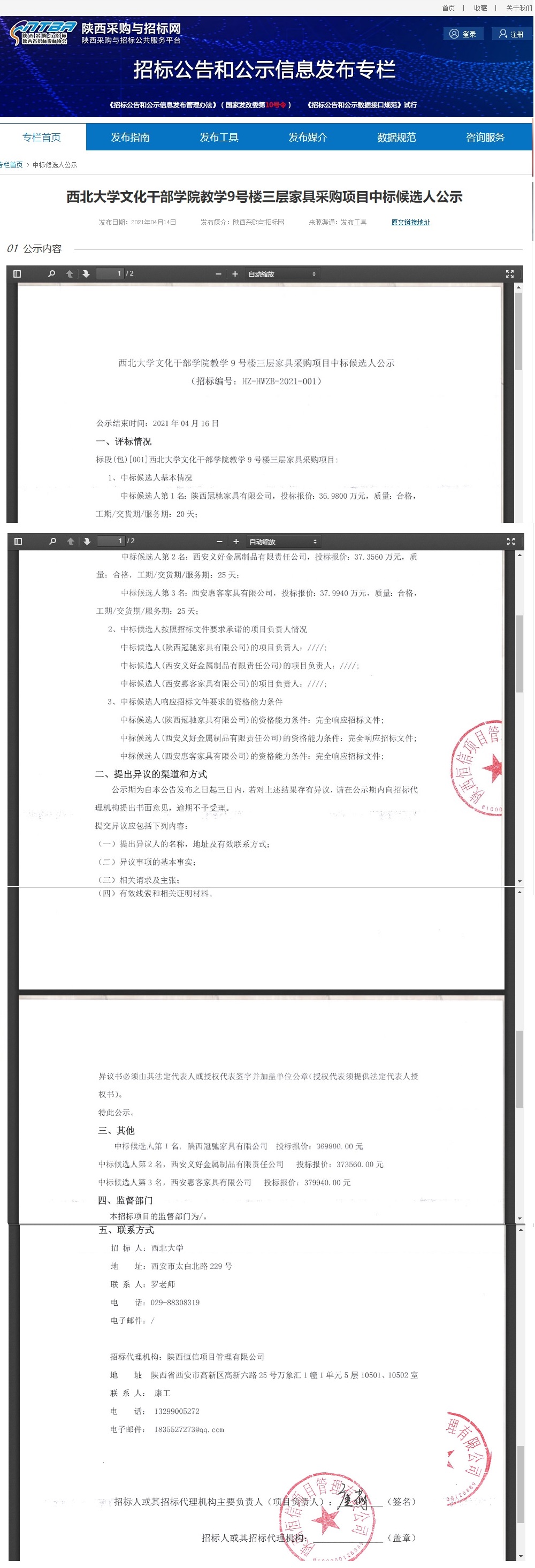 乐投平台文化干部学院教学9号楼三层家具采购项目中标候选人公示