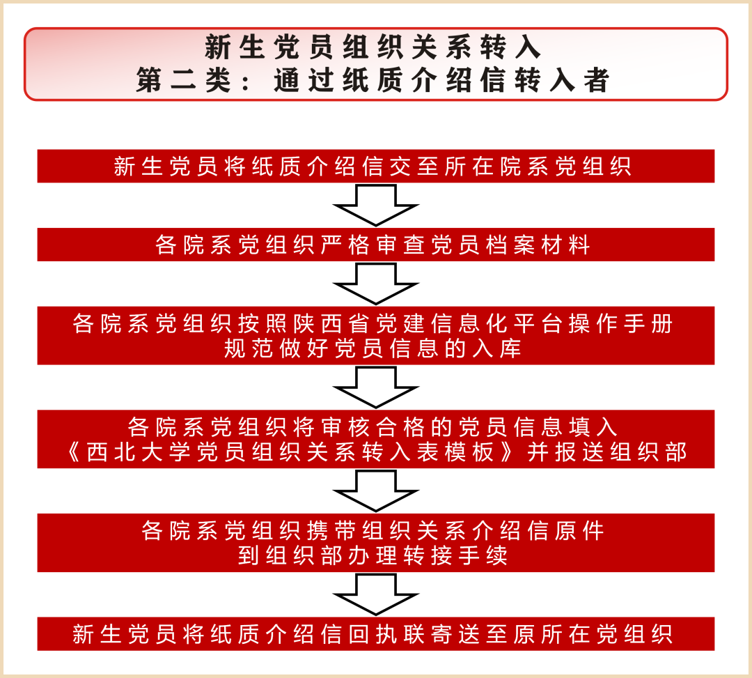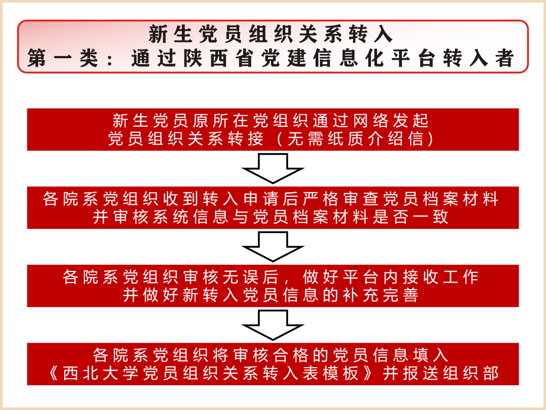 1.所有新生党员的组织档案和部分无法通过网络转接的党员组织关系介绍信由各党委(直属党支部)接收后,统一办理党组织关系接转手续。