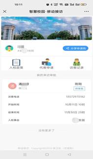 访客申请完成后,系统会将欢迎入校的短信发送至来访人员,在预约日期内持本人身份证或访客二维码到门卫处核验通过即可入校。