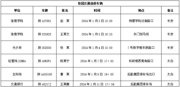 为加强校内道路交通安全管理,规范校内交通秩序,根据《乐投平台校园道路交通管理办法》有关要求,现将2024年1月校园交通违章车辆予以曝光,所在单位负责对本单位违章师生员工进行交通安全教育和日常管理。