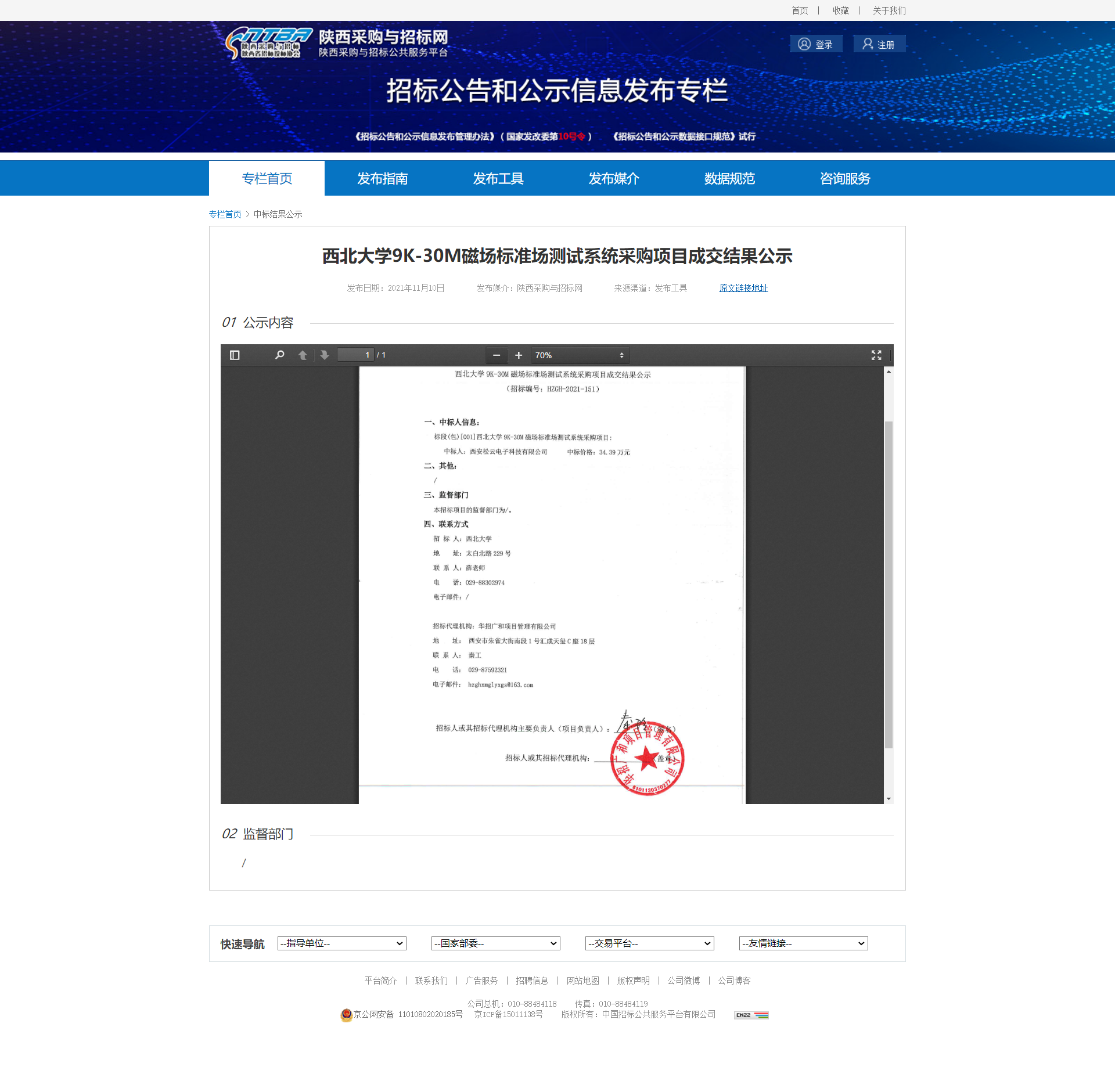 乐投平台9K-30M磁场标准场测试系统采购项目成交结果公示 作者: 编辑:薛利娟 时间:2021-11-11 原公告网址:http://bulletin.sntba.com/resultBulletin/2021-11-10/362788.html