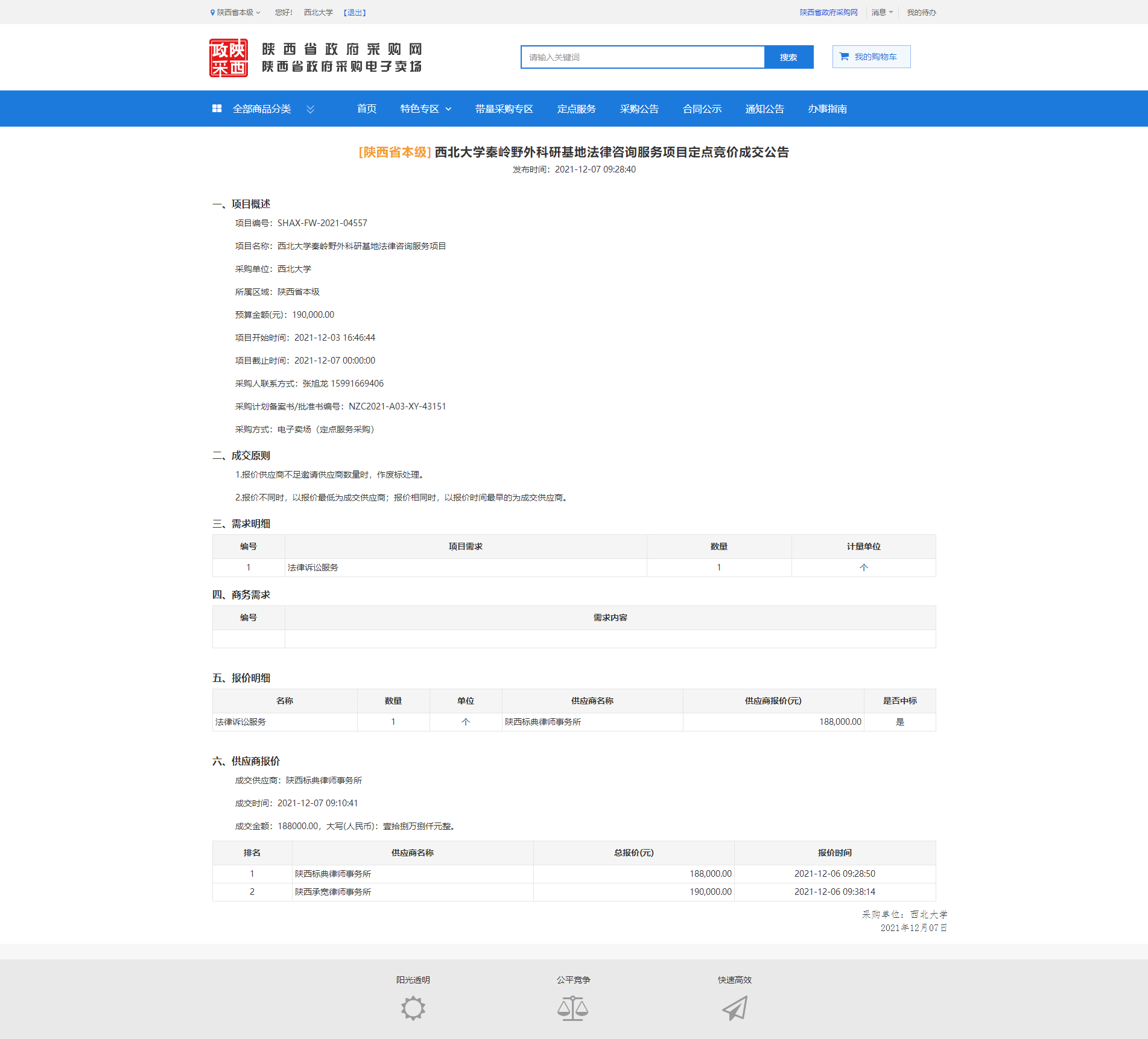 关于乐投平台秦岭野外科研基地法律咨询服务项目定点竞价成交公告