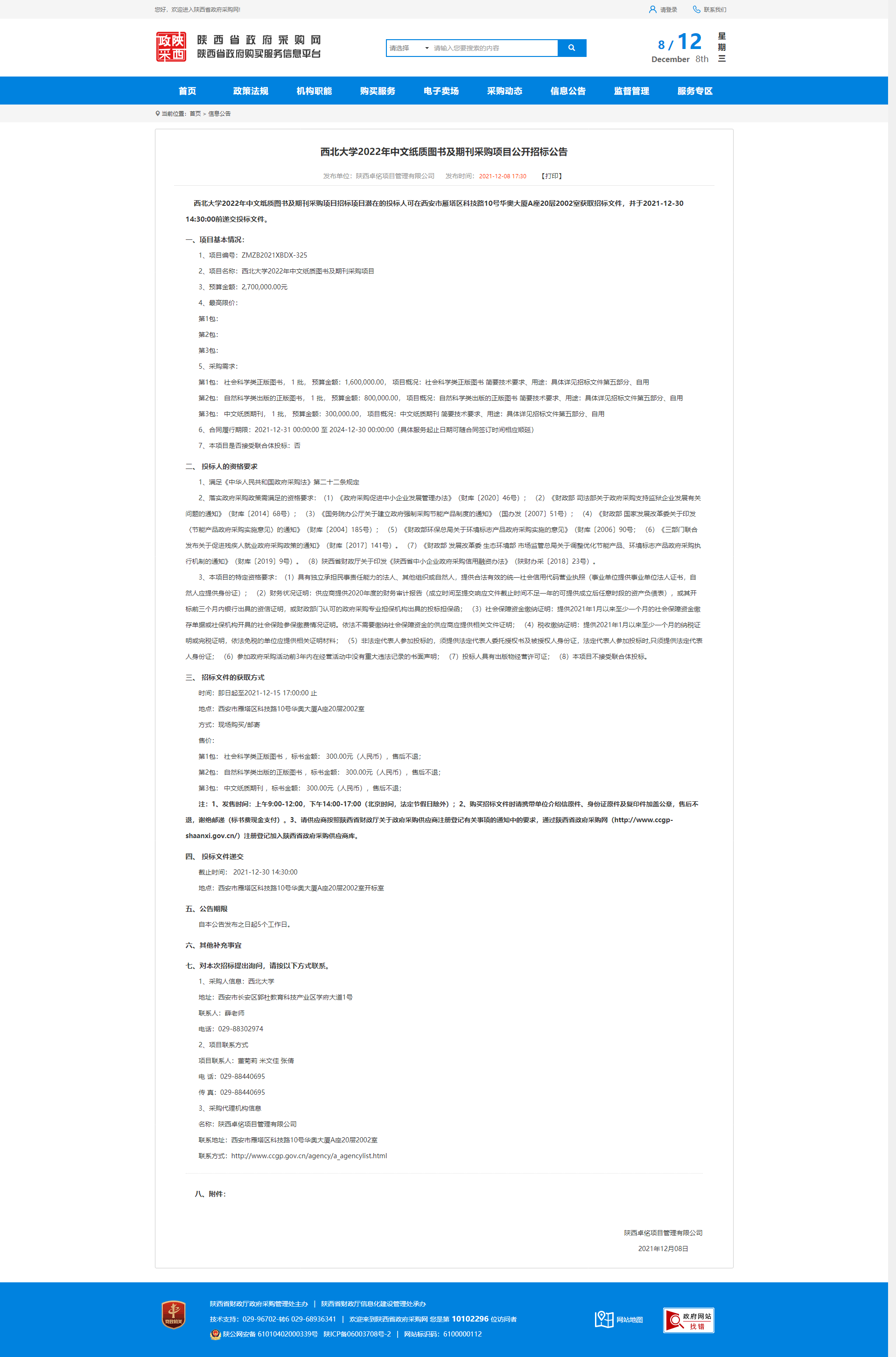 乐投平台2022年中文纸质图书及期刊采购项目公开招标公告 作者: 编辑:薛利娟 时间:2021-12-08 原公告链接:http://www.ccgp-shaanxi.gov.cn/notice/noticeDetail.do?noticeguid=8a85be317d6a7607017d991af3612a99