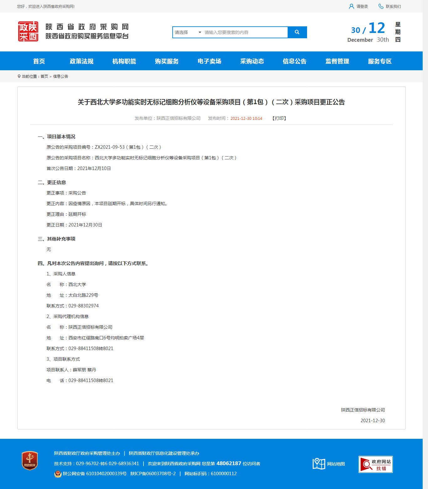 关于乐投平台多功能实时无标记细胞分析仪等设备采购项目(第1包)(二次)采购项目更正公告 作者: 编辑:薛利娟 时间:2021-12-30 原公告链接:http://www.ccgp-shaanxi.gov.cn/notice/noticeDetail.do?noticeguid=8a85be337debad6b017e09039d8453ea