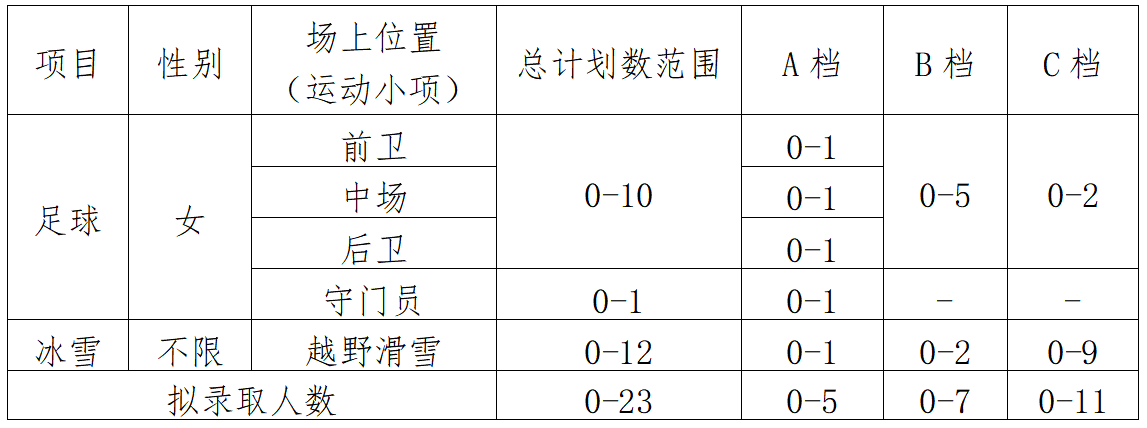 注:1.乐投(中国)一站式服务平台原则上按照A档、B档、C档已公布招生计划的1:1比例确定相应的优惠等级考生名单;若全国统测体育专项分相同,则比较指定的子项目分数或成绩(①越野滑雪比较测试滑行速度成绩(秒)。②足球非守门员依次比较实战能力(比赛)技术成绩、传准技术成绩、运射技术成绩、5×25米折返跑技术成绩;足球守门员依次比较实战能力(比赛)技术成绩、扑接球成绩、掷远与踢远成绩、立定三级跳远成绩。)。