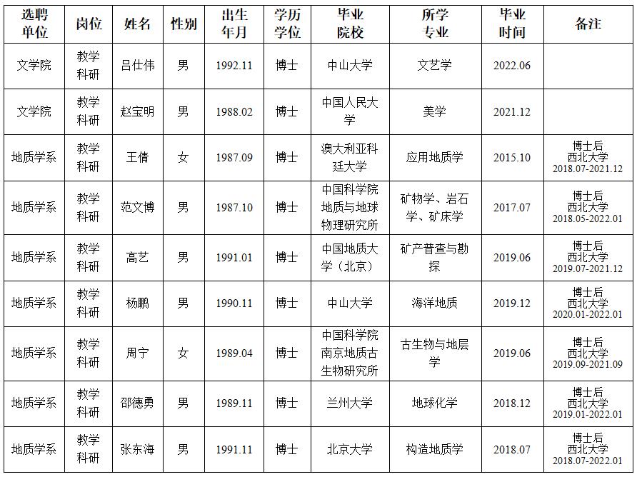 关于教学科研单位选聘教师情况的公示 作者: 编辑:岗位聘用办公室 时间:2022-01-17 经用人单位及教学督导考核、学校研究,拟同意选聘下列人员来校工作,其聘任关系为A类人事代理。本着公平、公正、公开的原则,现将拟选聘人员基本情况公示如下: 各单位或个人如对上述人选存有疑问,可在2022年1月23日前以书面形式向人力资源部反映。反映材料须实名提交,以便我部核实并反馈,我们将严格保密。(因疫情防控,公示期结束后签订三方协议、开具接收函等手续,请联系工作人员沟通确定后另行办理。) 联系电话:029-88308221 15129051753 乐投平台人力资源部 2022年1月17日